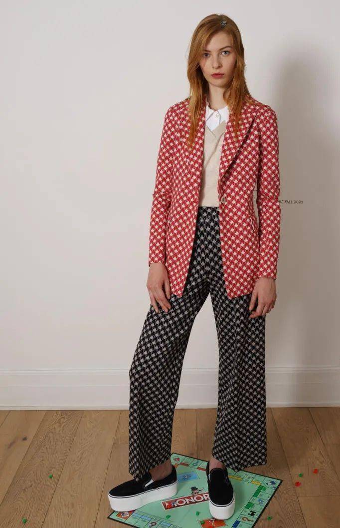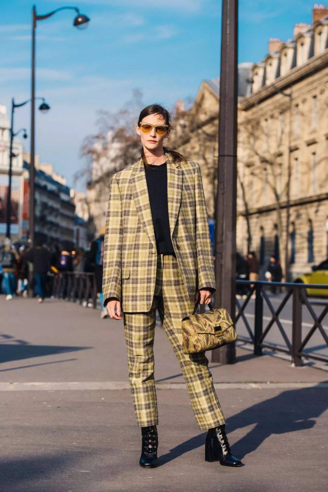 格子西裝成套穿著,搭配一件純色內(nèi)搭,鞋子的顏色可以內(nèi)搭或西裝的顏色呼應(yīng)起來。