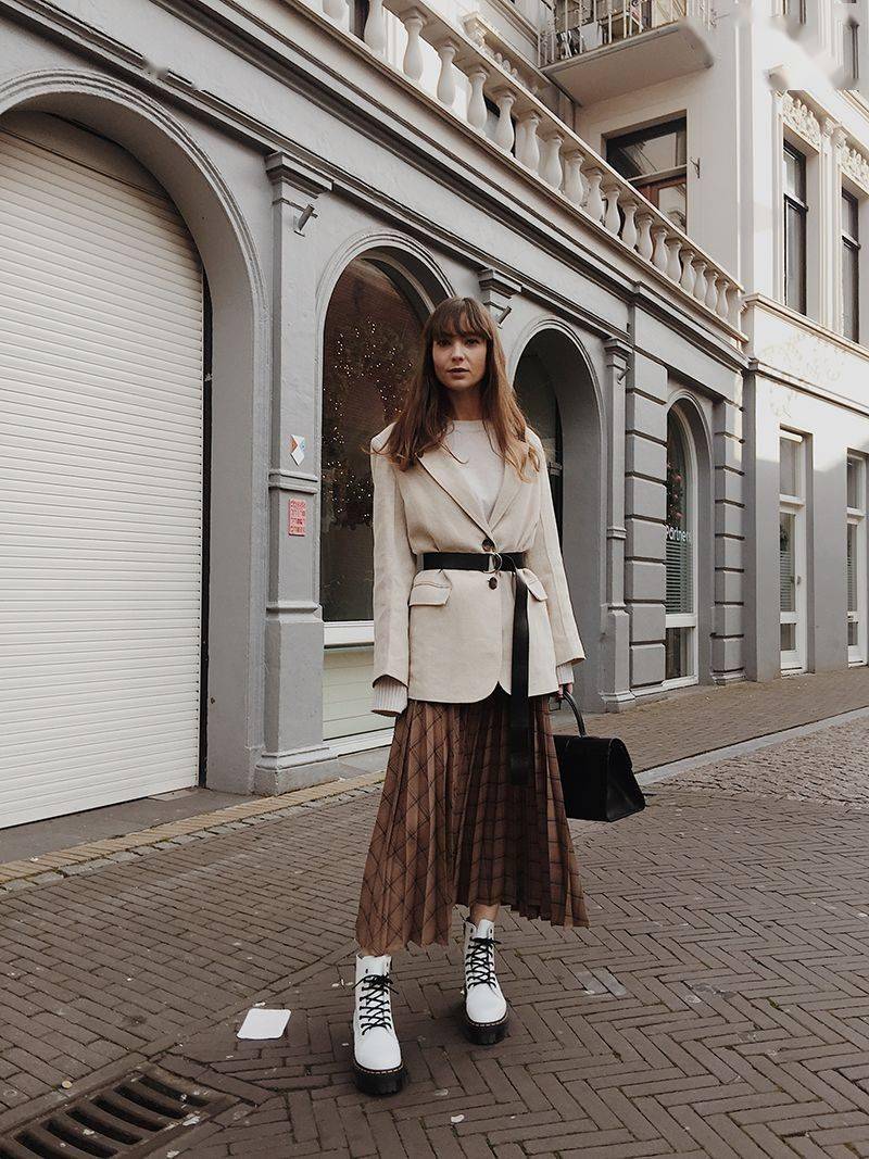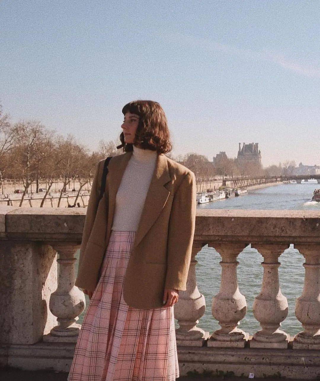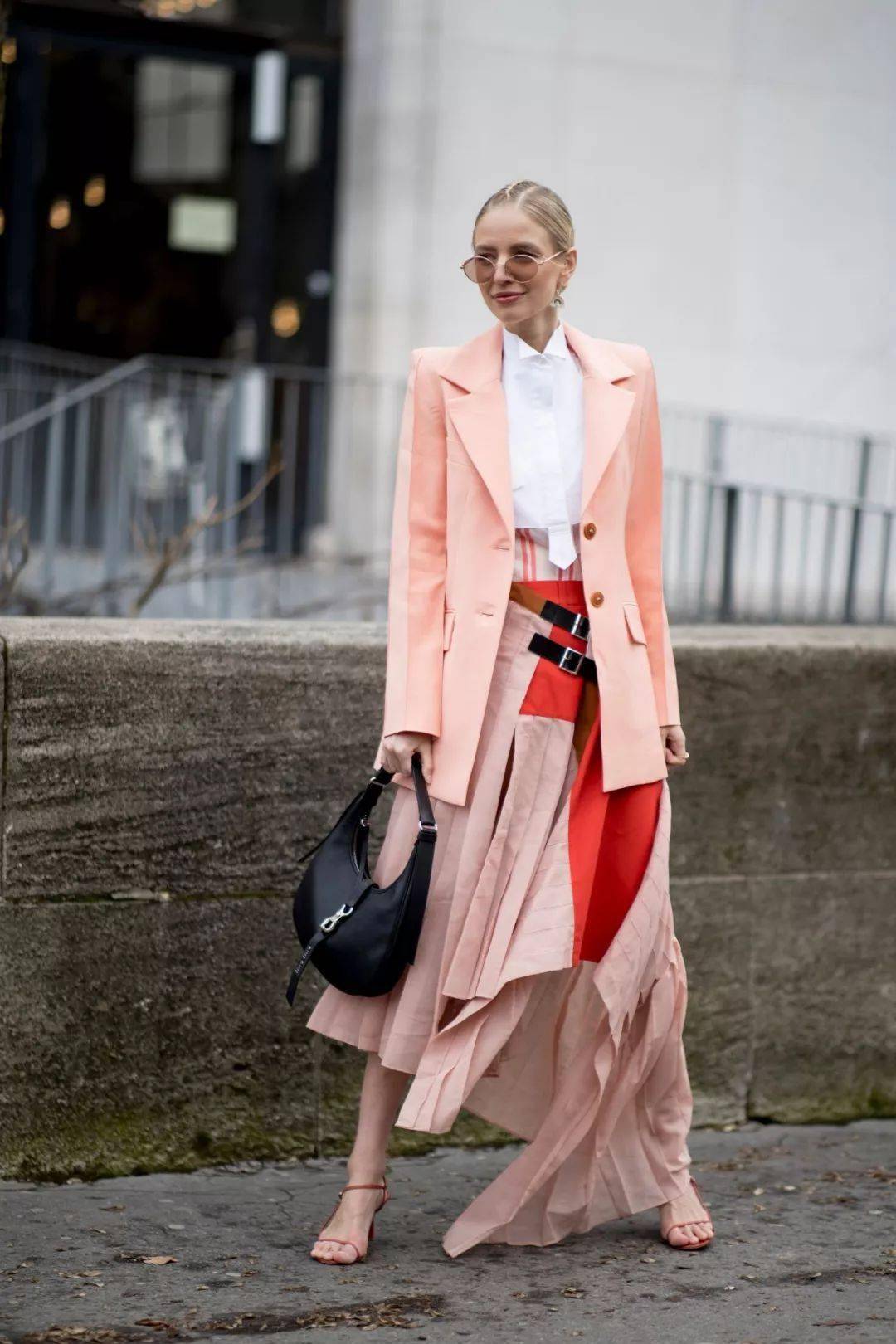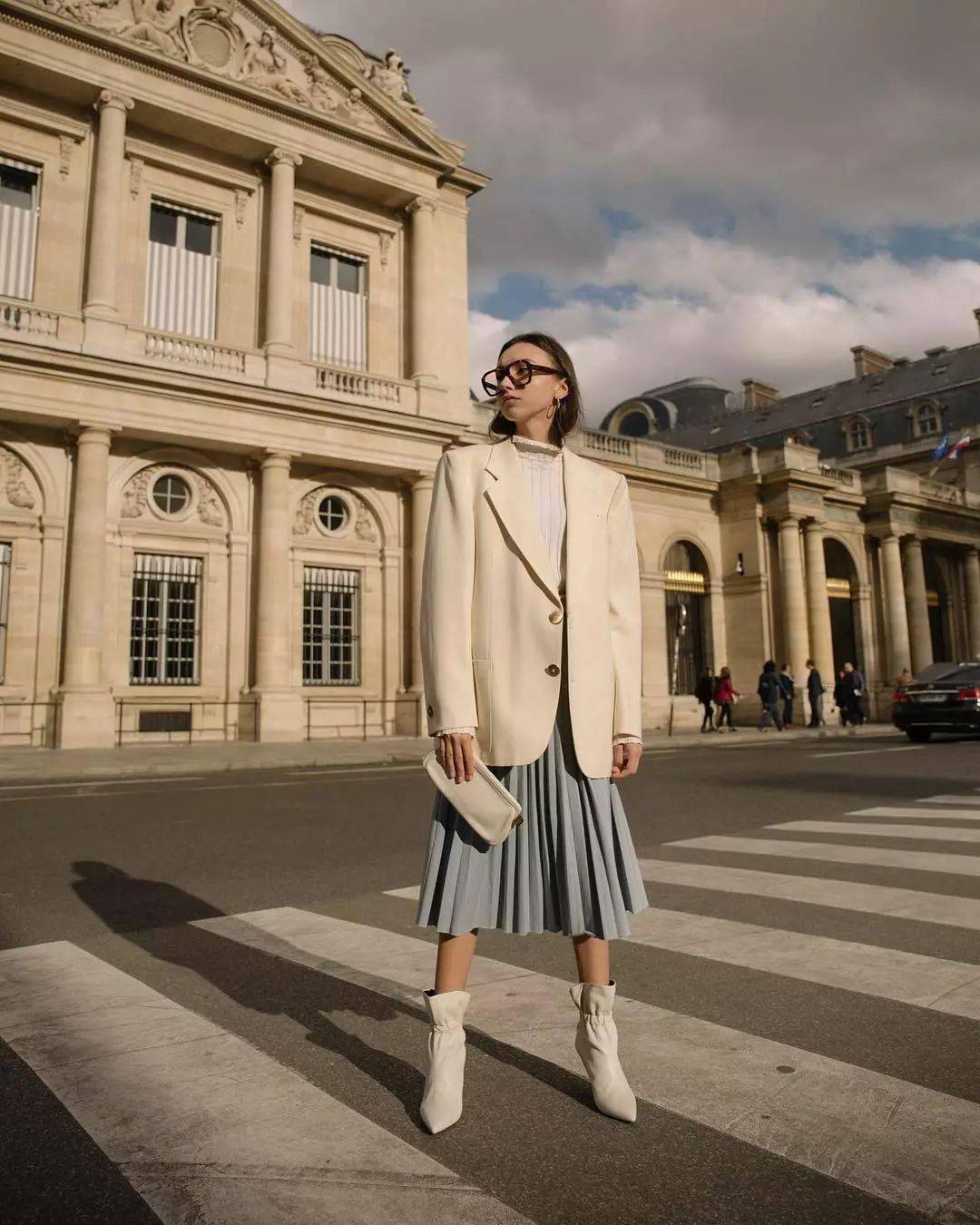 ol風(fēng)的百褶裙搭配小西裝,干凈利落,沉穩(wěn)又充滿活力。