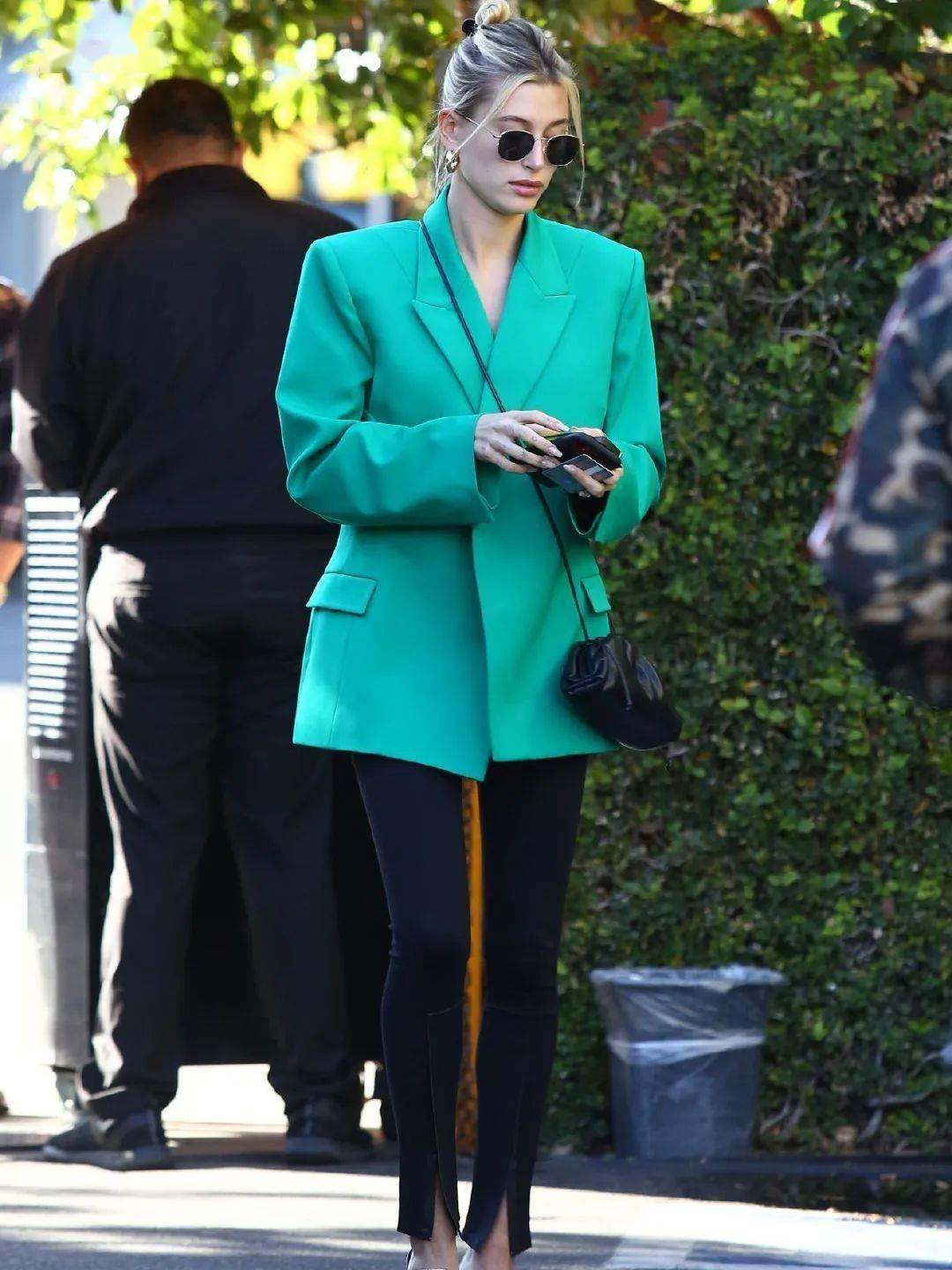 Hailey Baldwin(海莉·鮑德溫)用廓形西裝搭配小黑褲,雙腿又細(xì)又長,絕了!