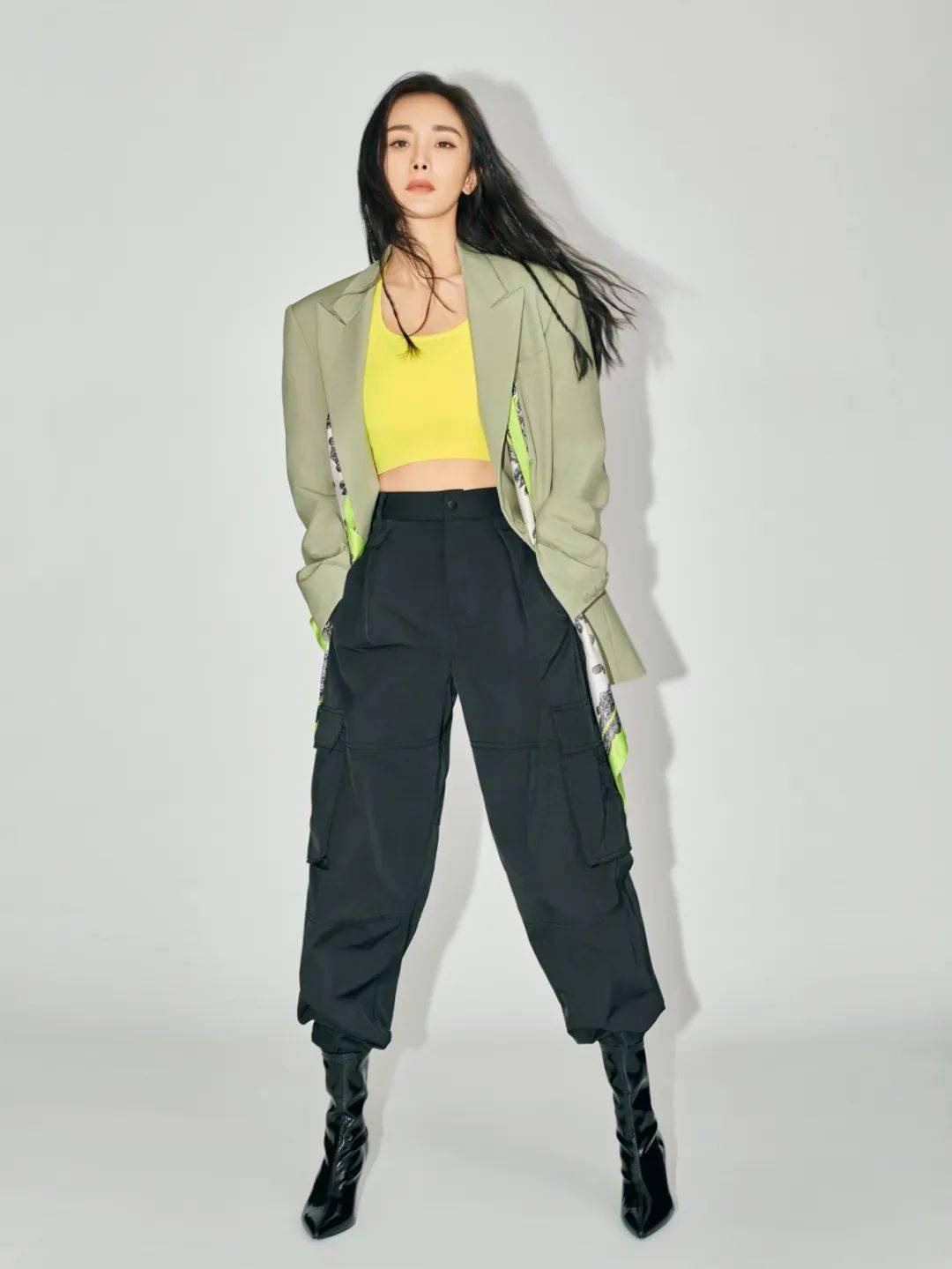 楊冪也是用廓形西裝搭配短上衣,明亮的黃讓人眼前一亮,下裝則是選擇了一條寬松的工裝褲,搭配短靴,小蠻腰絕了。