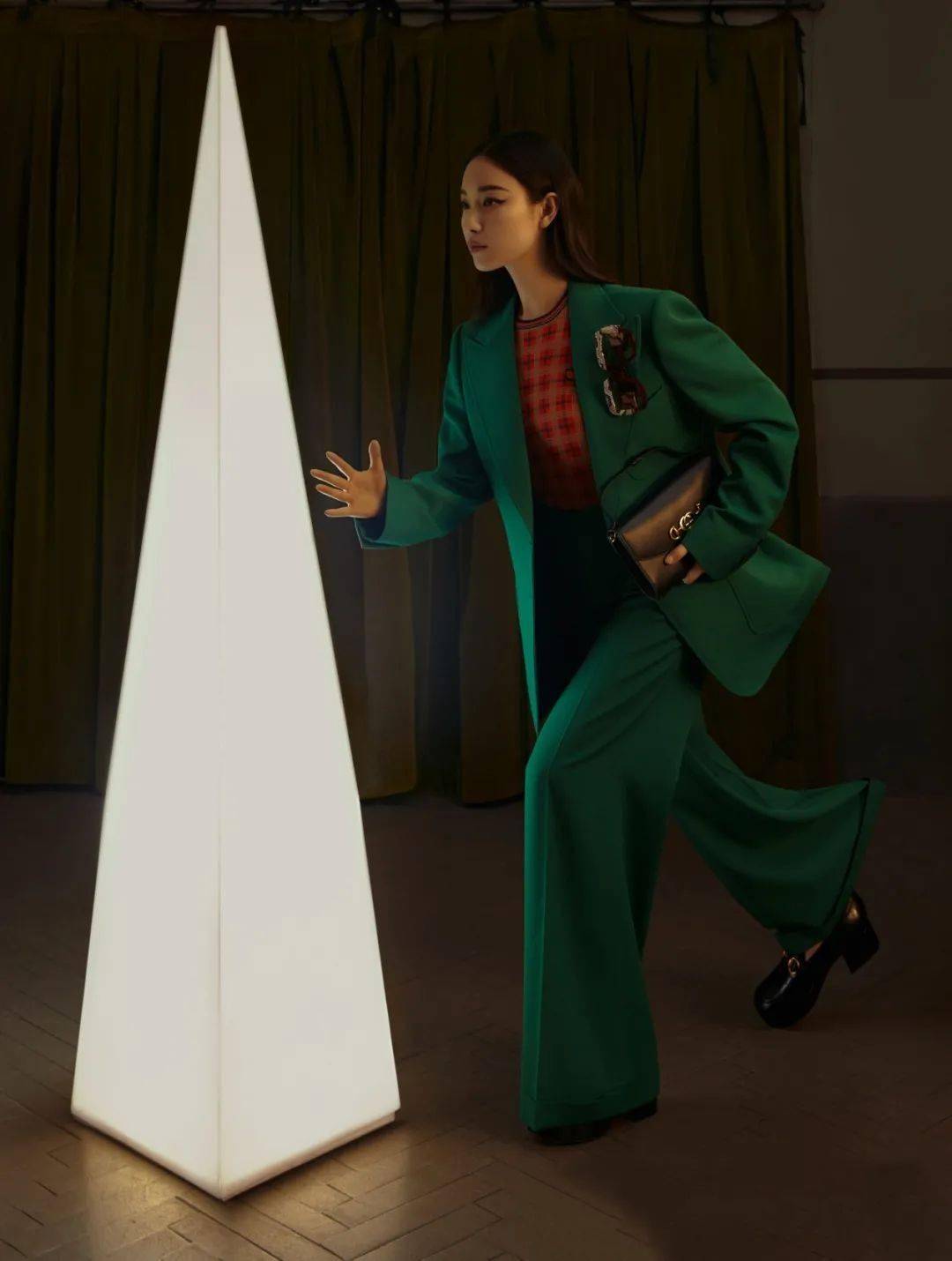 西裝可以hold住多種場合,倪妮超會穿,用綠色西裝搭配紅色打底衫,復(fù)古撞色搭配摩登時(shí)髦。