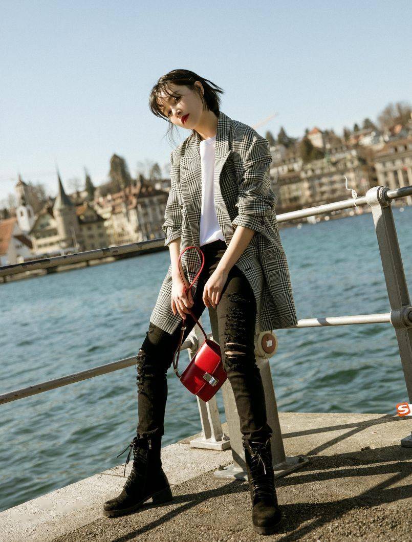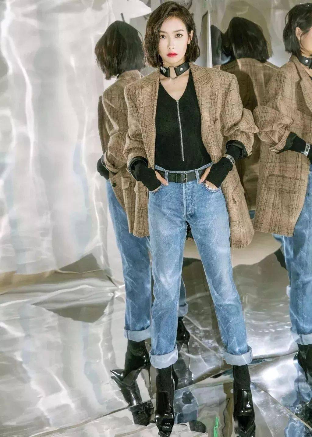 宋茜大地色格子西裝搭配牛仔褲,一個(gè)字:“帥”。