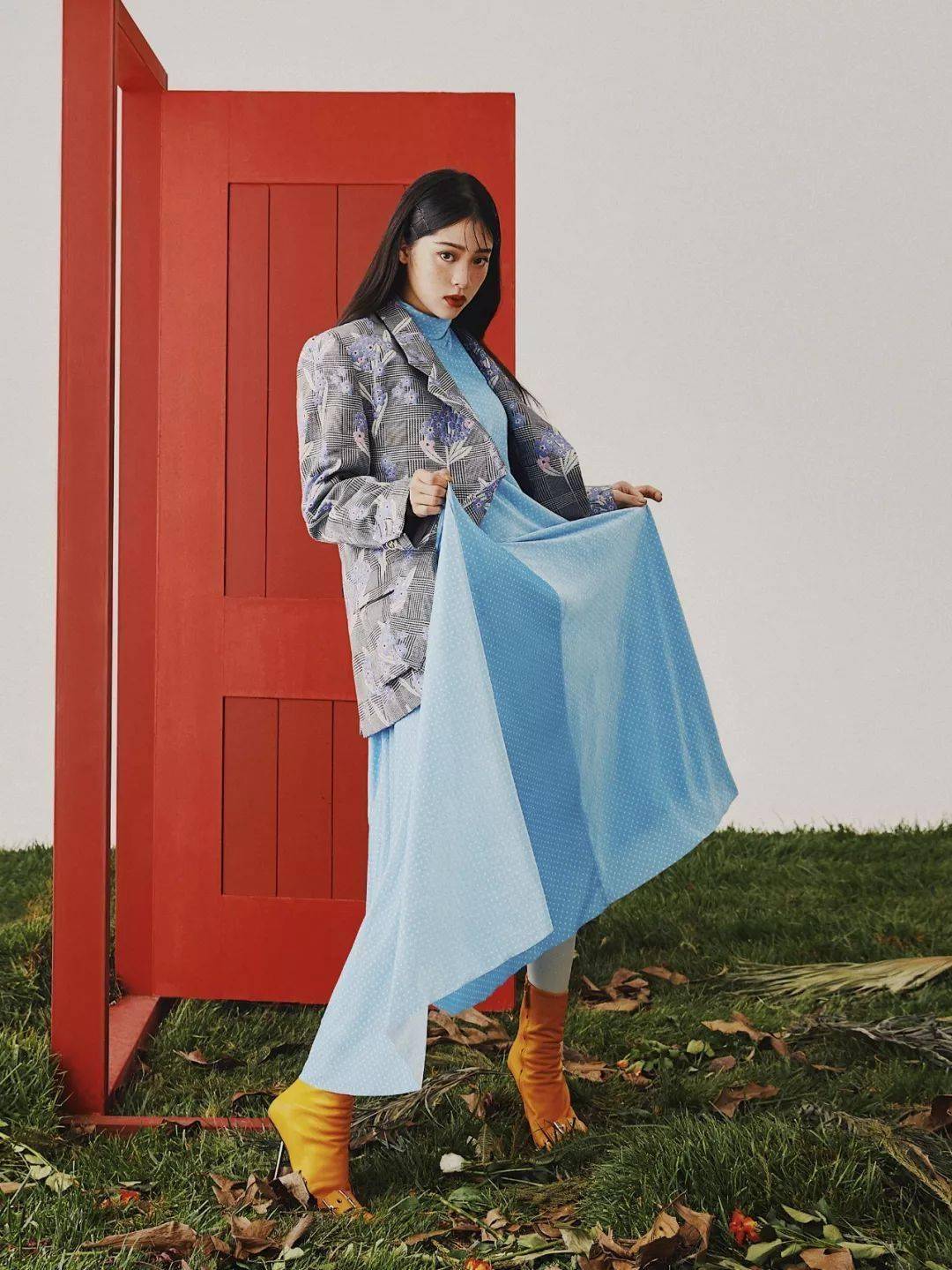 歐陽娜娜用灰色格紋西裝搭配冰藍(lán)色長裙,西裝上的印花設(shè)計(jì)更顯精致特別,再搭配一雙短靴,最靚組合送上。