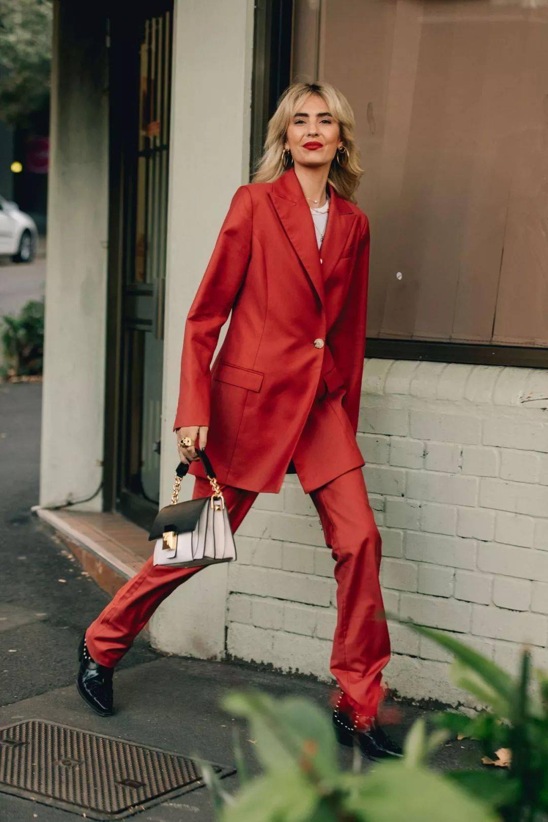 大紅色西裝可以搭配一些中性色單品和配飾。
