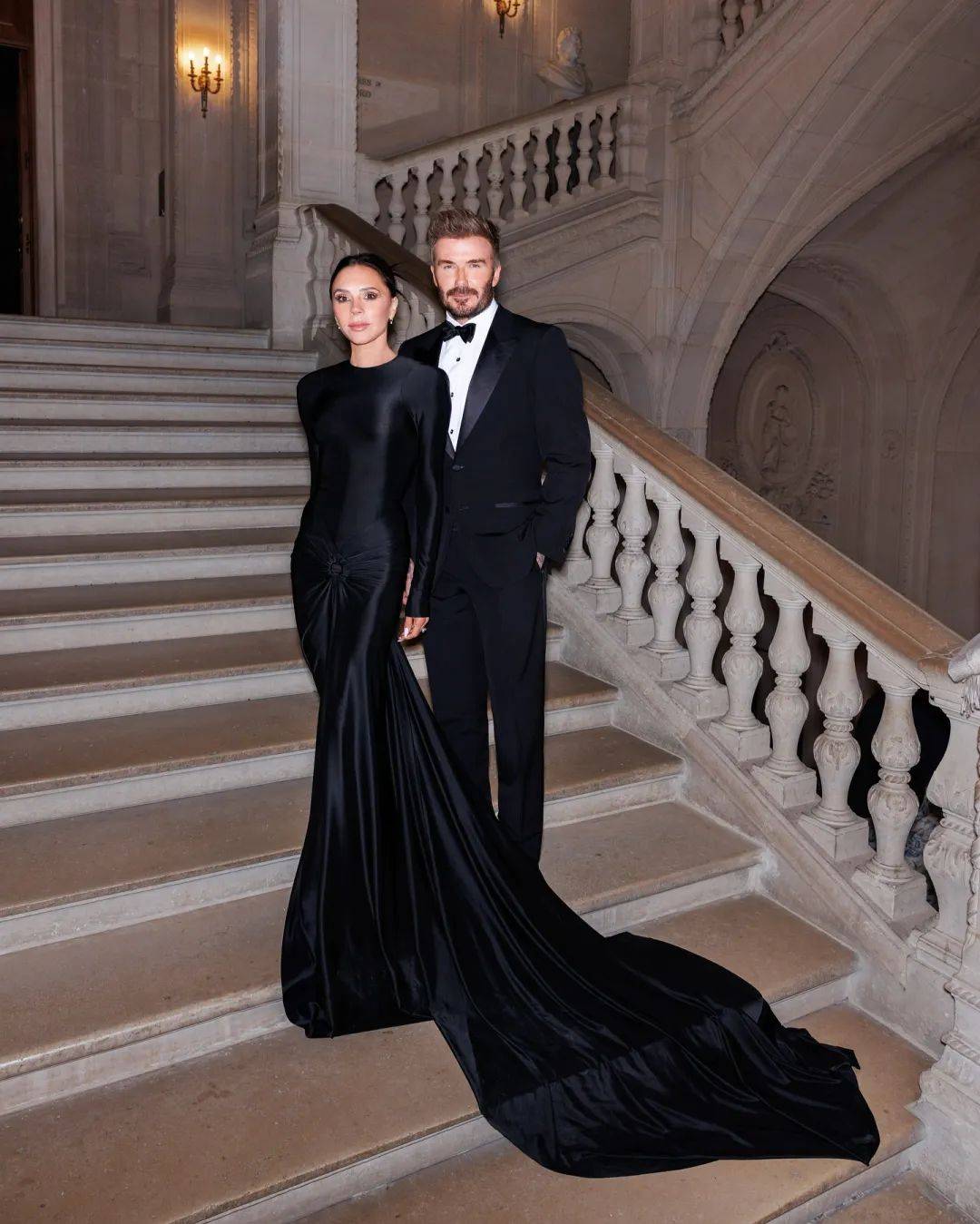 貝嫂一襲黑色魚尾長裙,小貝則是正裝西裝配領結(jié),一絲不茍的正裝Look,完美襯托出他“脫衣有(肌)肉,穿衣顯瘦”的教科書身材~