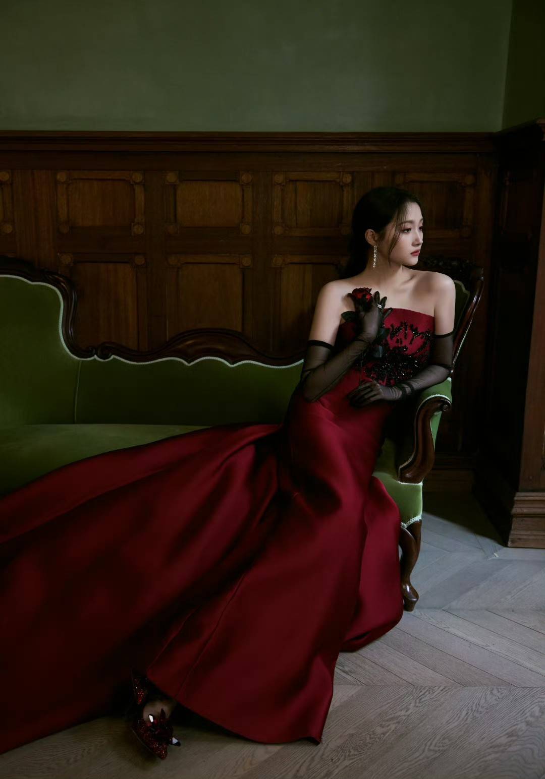 整身禮服穿在她的身上,讓關(guān)曉彤看上去氣質(zhì)被減弱了很多,原本引以為傲的大長腿,在這套禮服的加持下,也不明顯了,加上黑色的披肩長發(fā),整個人的脖子還有了前傾的感覺。