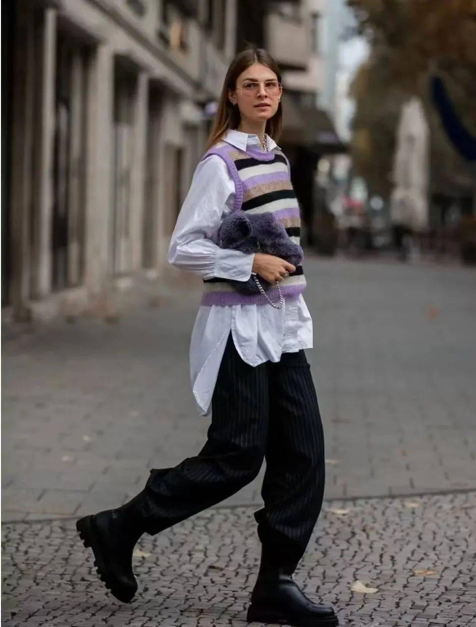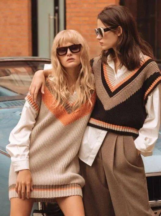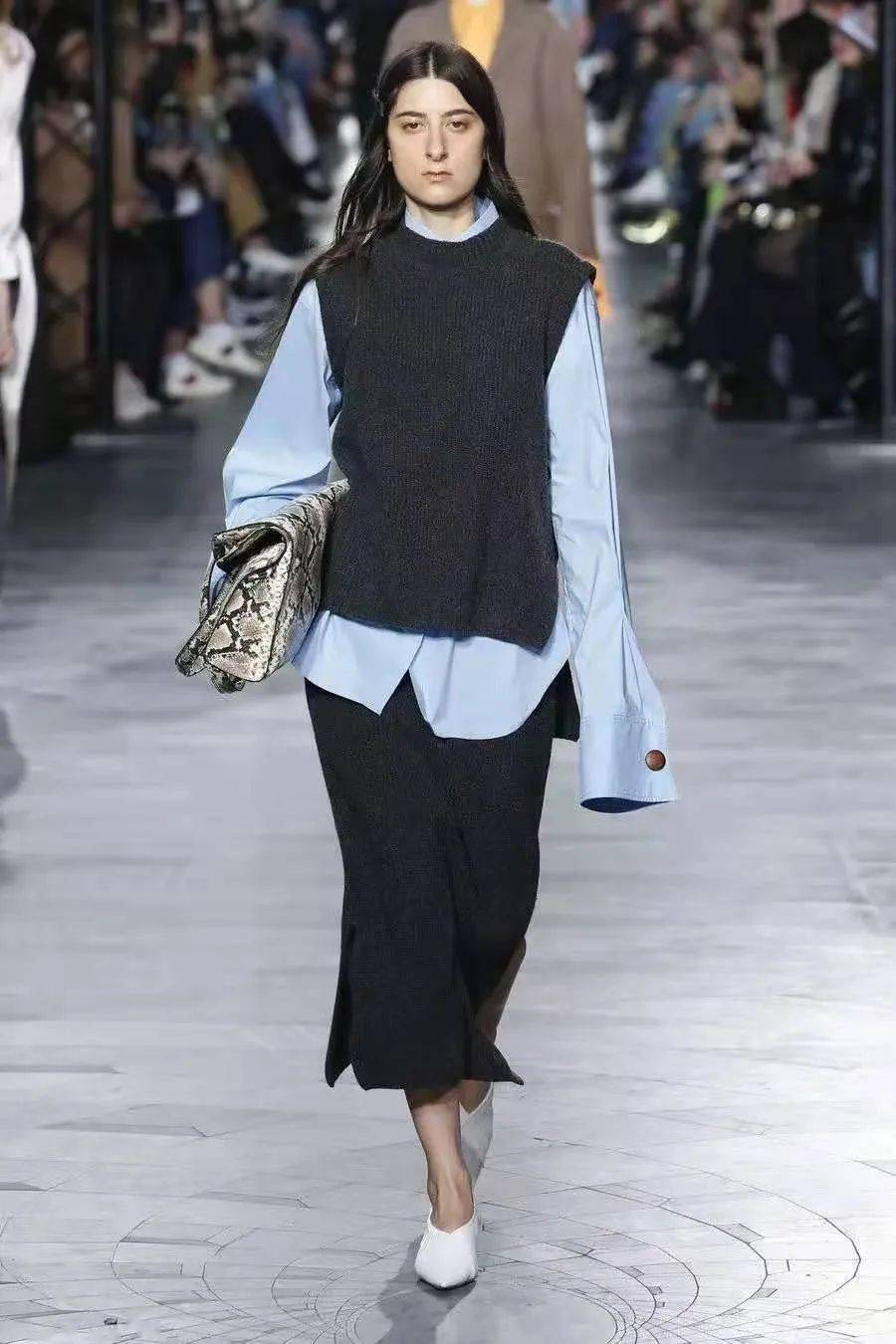 去年開始的街拍中,出現(xiàn)了很多把襯衫敞開變V領(lǐng),然后內(nèi)搭修身針織衫/T恤的組合。這樣穿也非常時髦,而且,襯衫的梭織面料和內(nèi)搭的針織面料,形成肌理對比,令搭配的細(xì)節(jié)感更豐富。