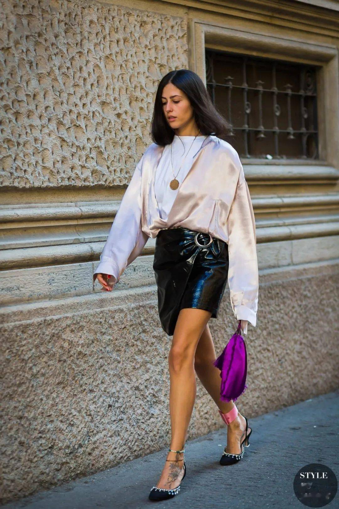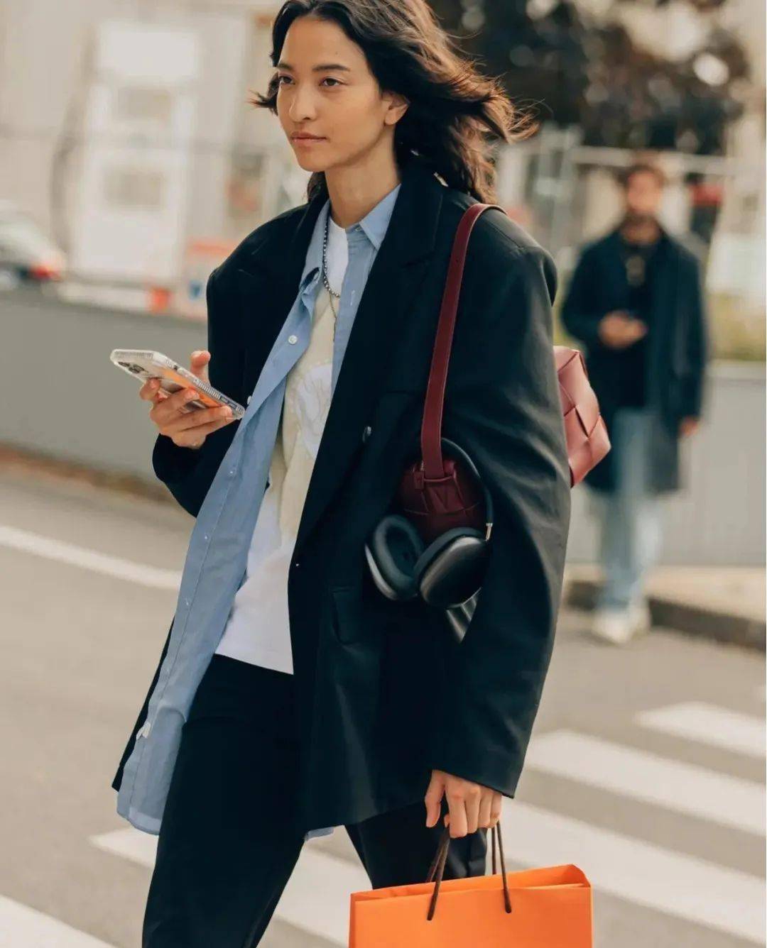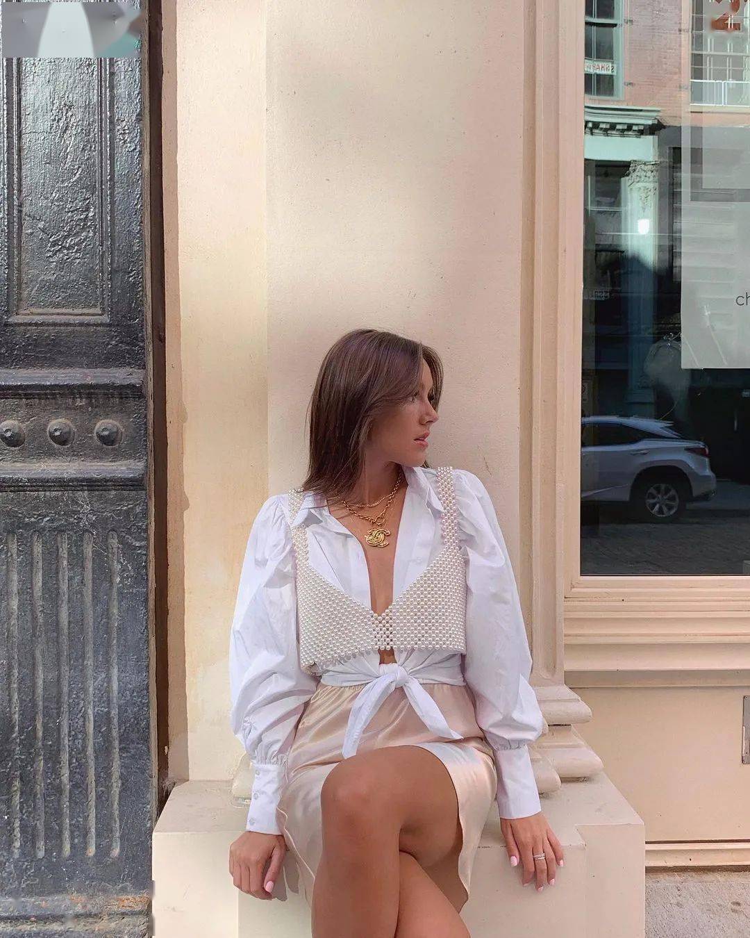 去年開始的街拍中,出現(xiàn)了很多把襯衫敞開變V領(lǐng),然后內(nèi)搭修身針織衫/T恤的組合。這樣穿也非常時髦,而且,襯衫的梭織面料和內(nèi)搭的針織面料,形成肌理對比,令搭配的細(xì)節(jié)感更豐富。
