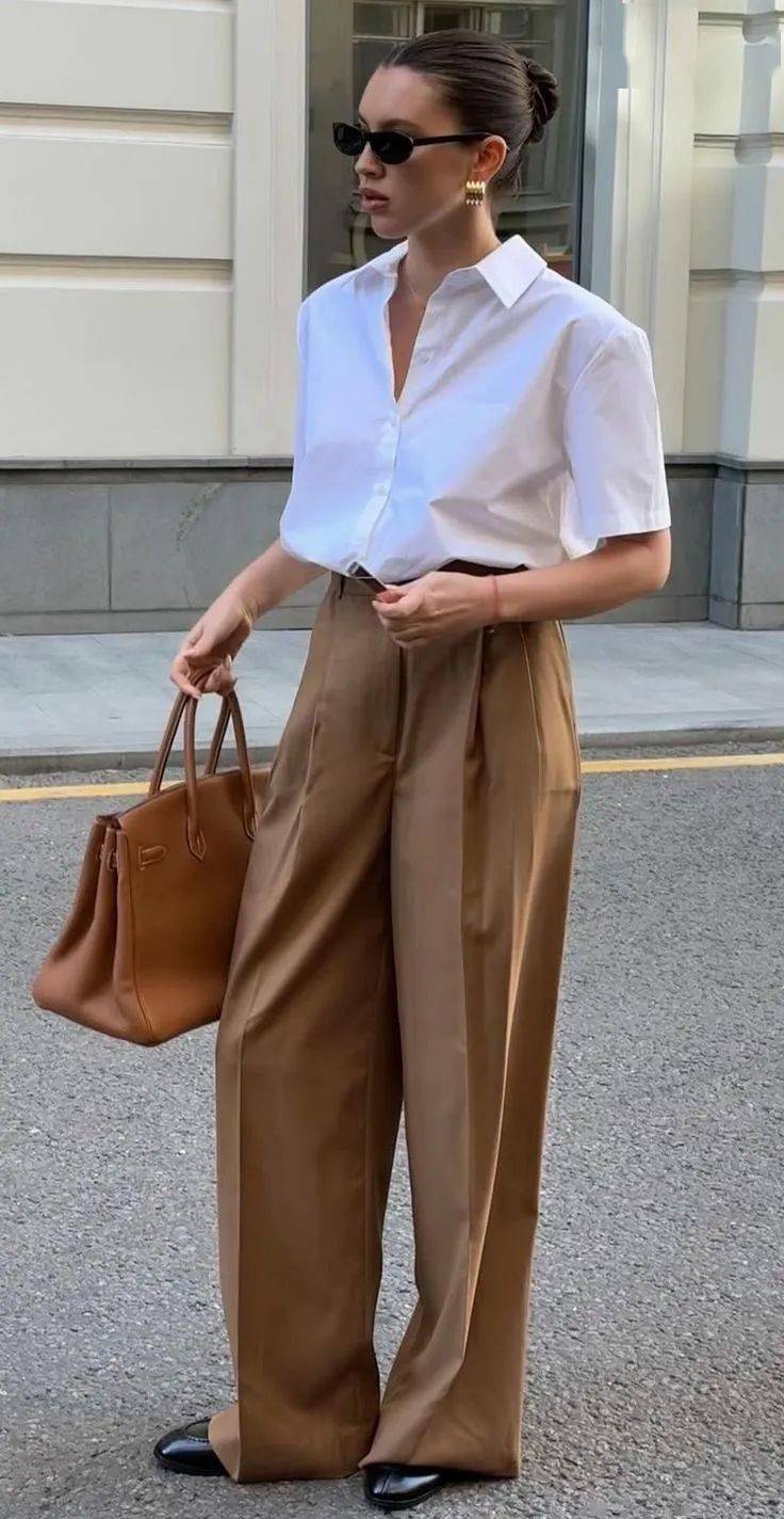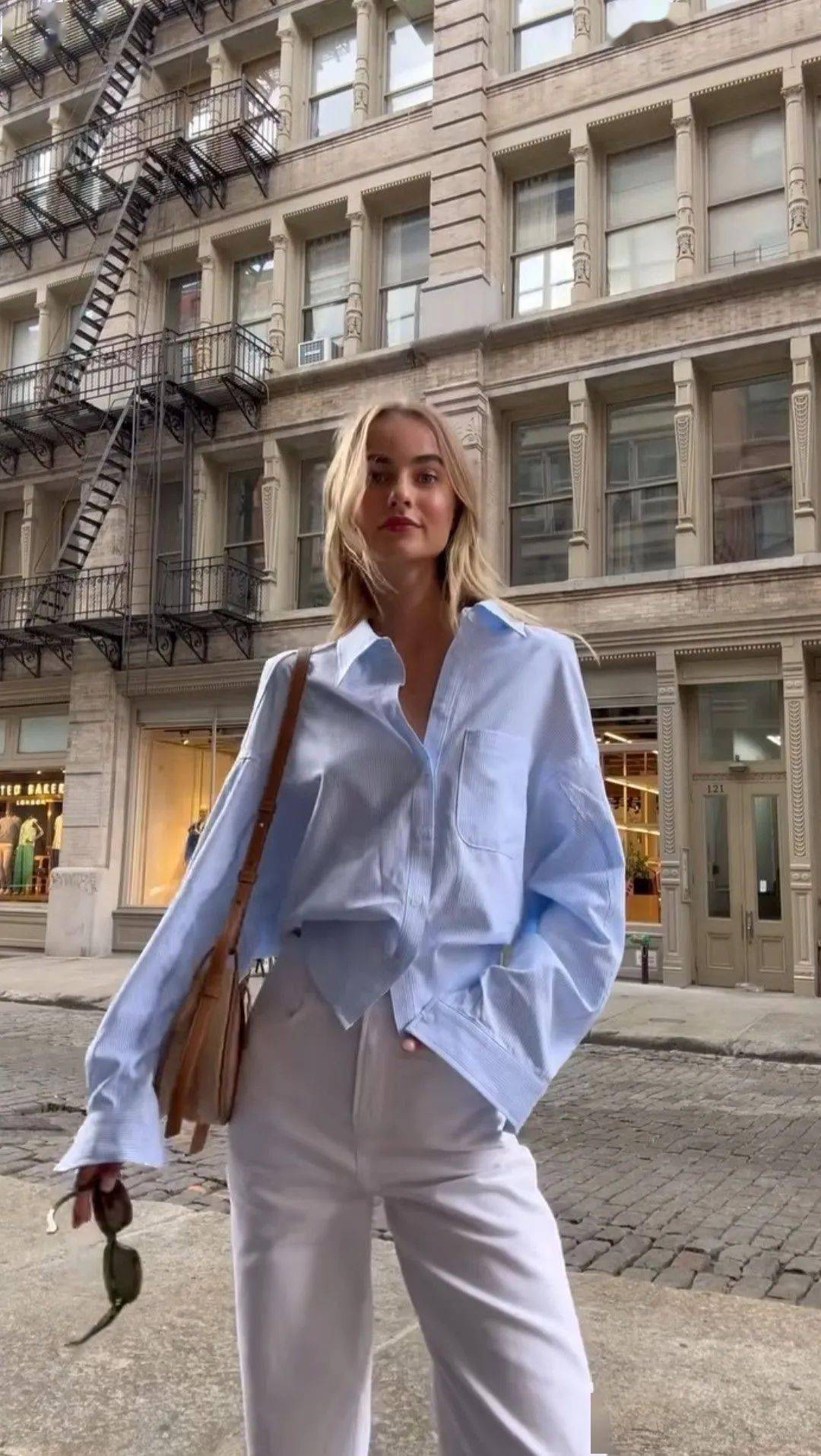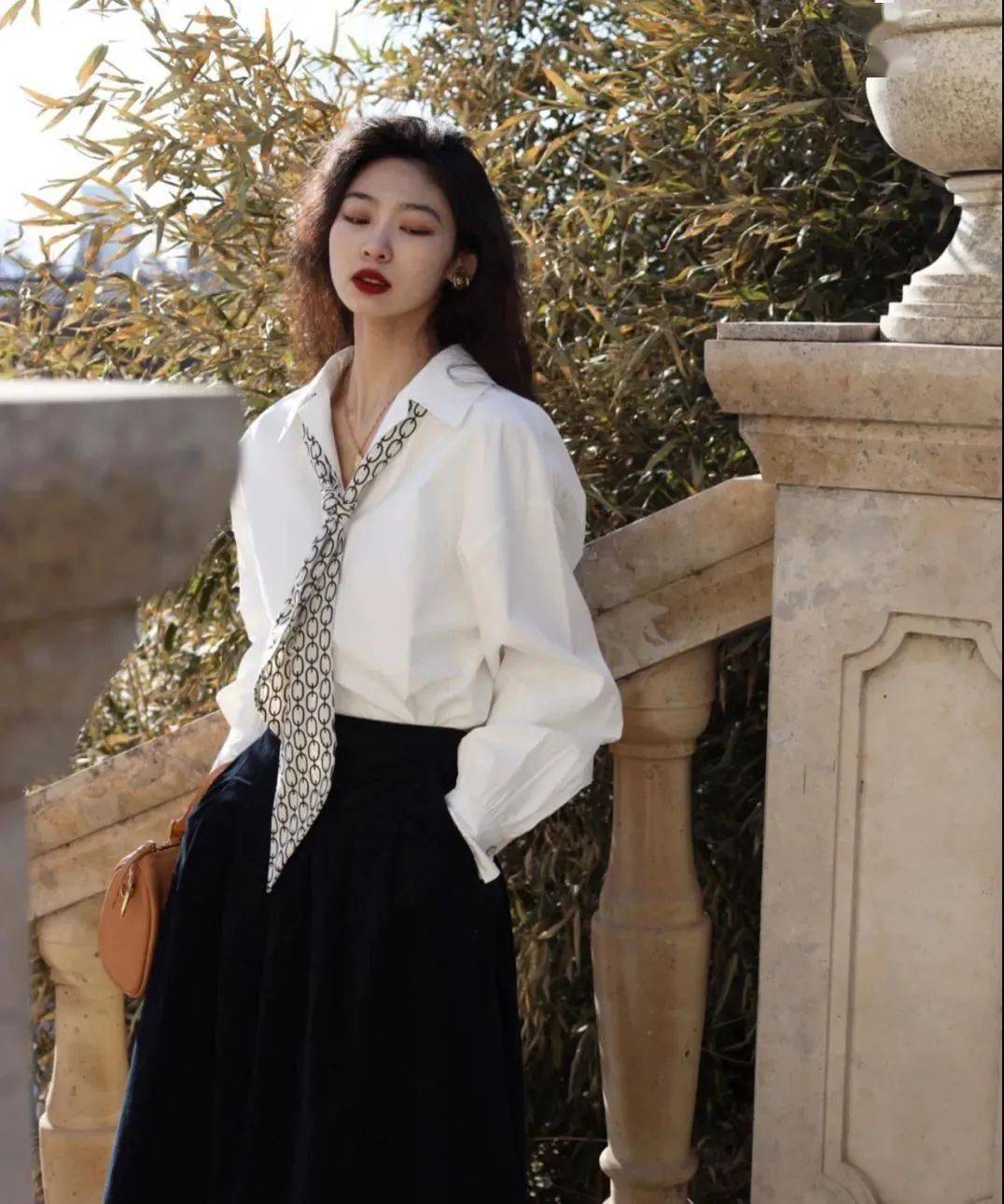 很多法風(fēng)博主,穿襯衫就是把領(lǐng)口敞開成V型,然后搭配高腰褲/高腰裙,上衣下擺塞腰頭,這樣整體搭配就呈現(xiàn)出X廓形,強調(diào)腰身曲線,再加上露腳踝、帶點跟的大面積露腳背的鞋子,涂口紅、注意的頭發(fā)風(fēng)蓬松感,就非常有女人味了。