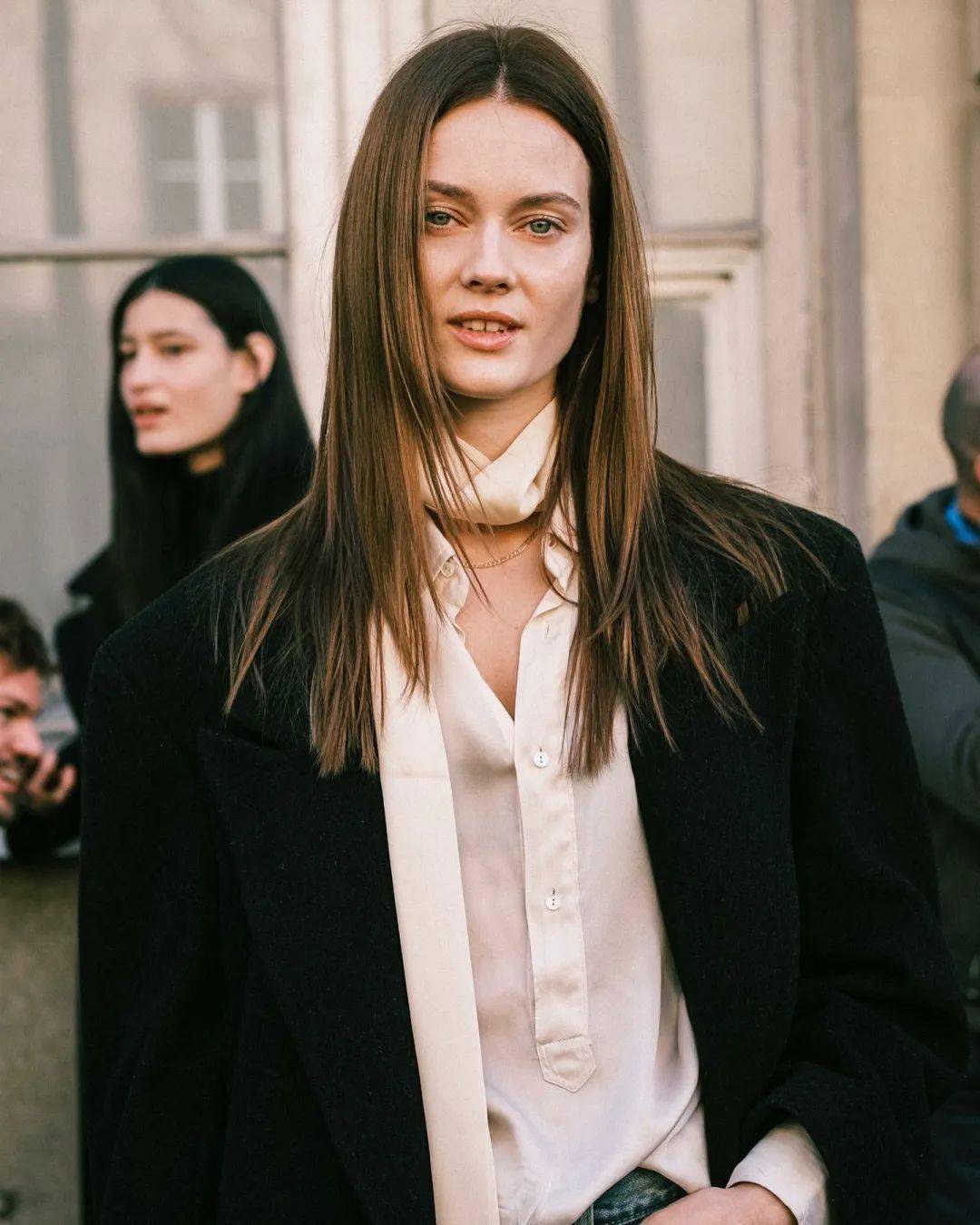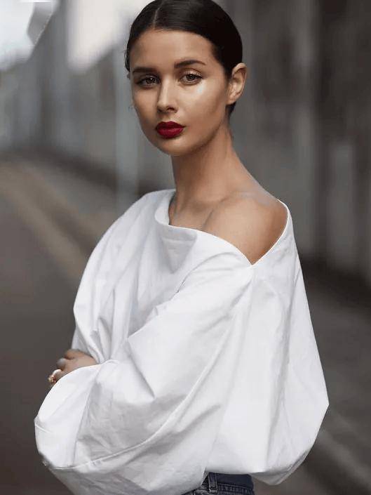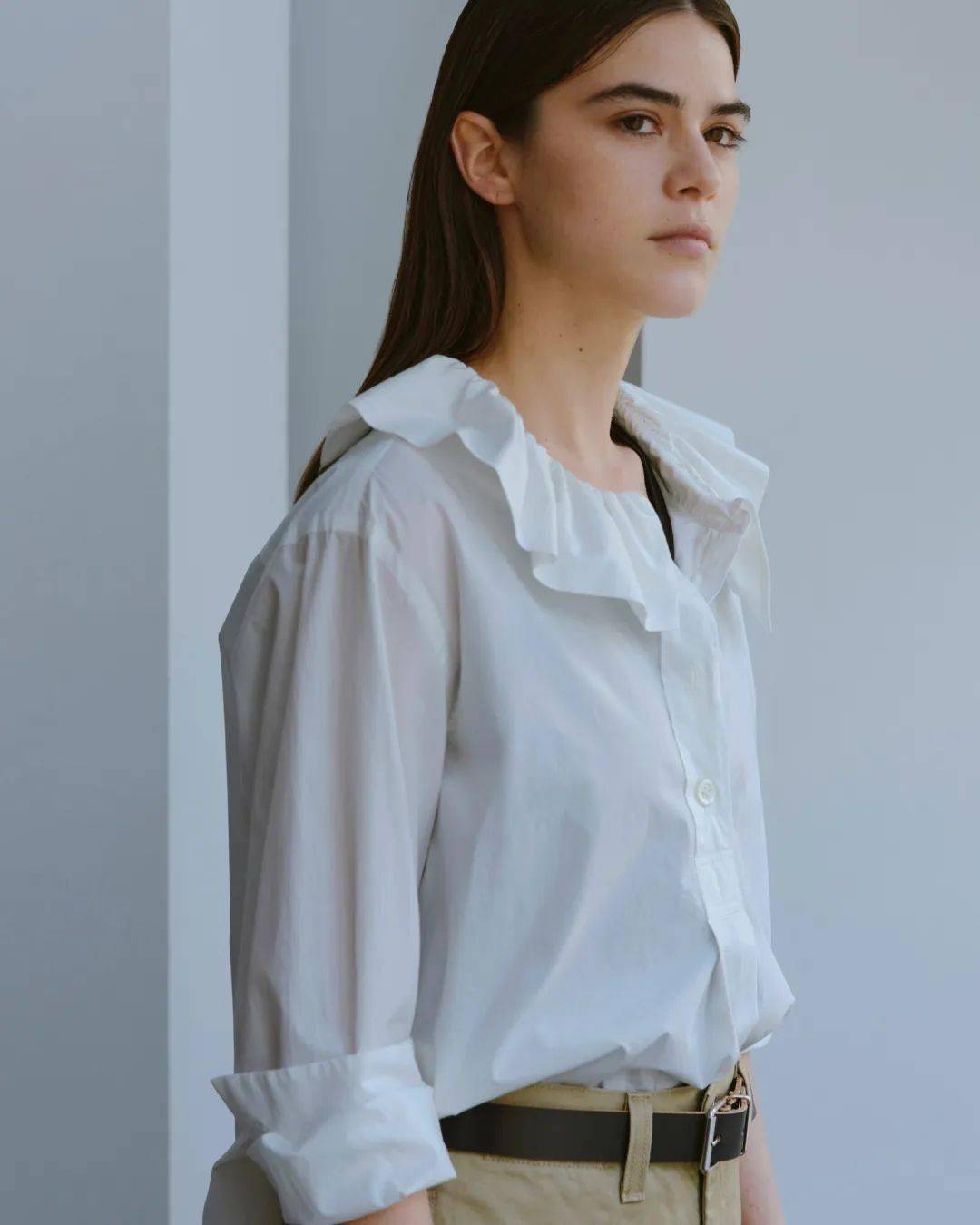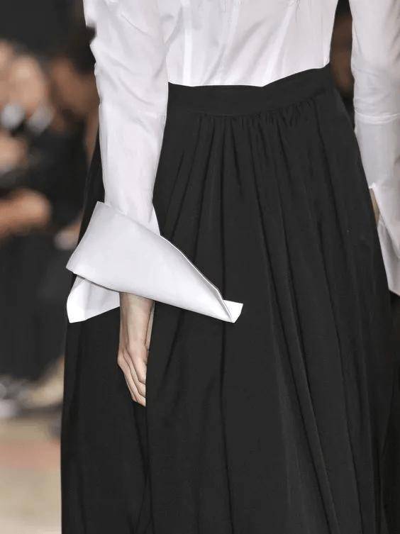 很多法風(fēng)博主,穿襯衫就是把領(lǐng)口敞開成V型,然后搭配高腰褲/高腰裙,上衣下擺塞腰頭,這樣整體搭配就呈現(xiàn)出X廓形,強調(diào)腰身曲線,再加上露腳踝、帶點跟的大面積露腳背的鞋子,涂口紅、注意的頭發(fā)風(fēng)蓬松感,就非常有女人味了。