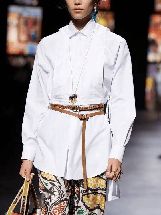 在寬松的襯衫外系腰帶,這樣襯衫就變成了短X廓形,下半身可以搭A(yù)型裙、八九分的闊腿褲/直筒褲/煙管褲等等,保障了高腰線,還能遮肚子、遮臀胯,這個穿法很適合腰腹胖的人。