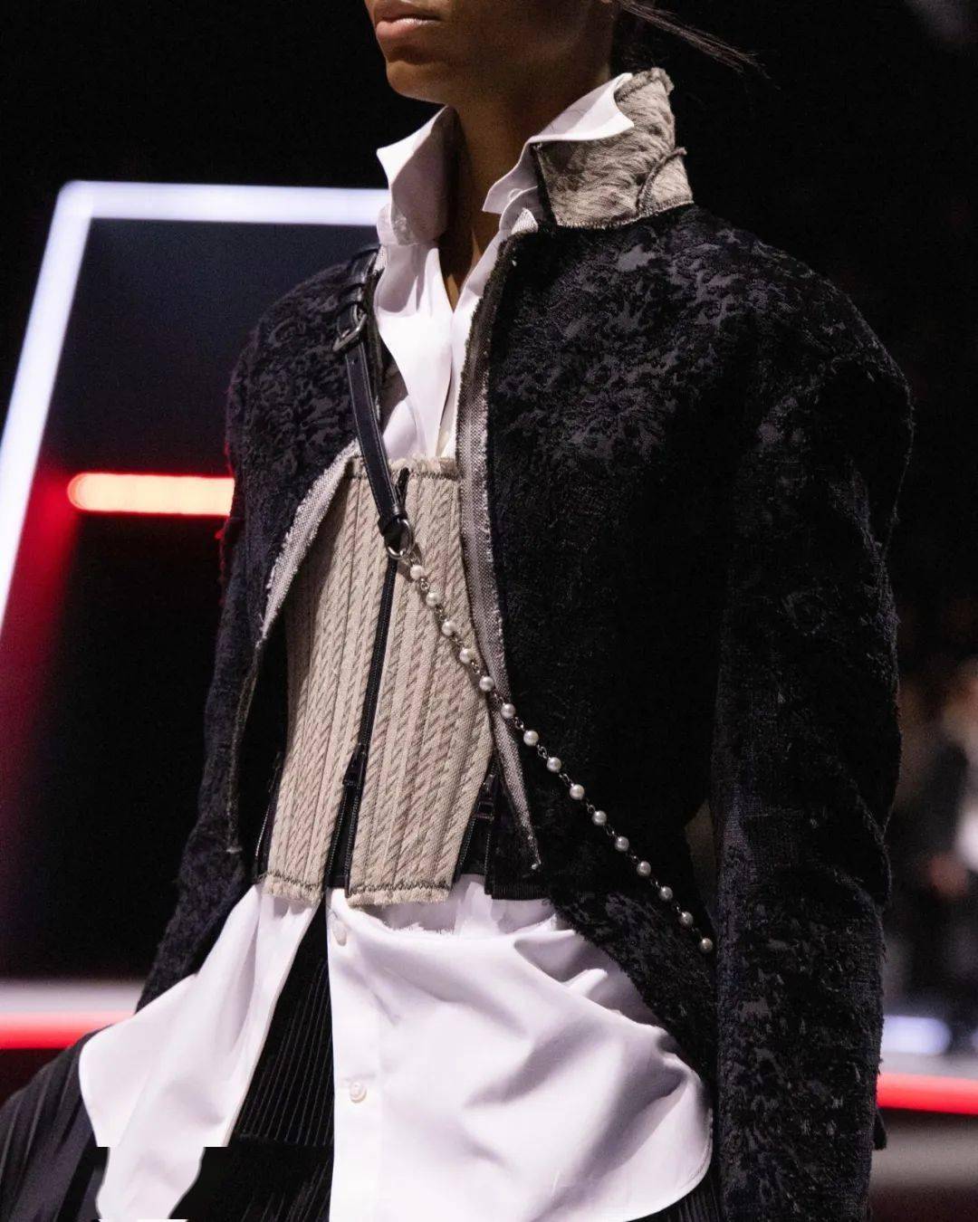 反向穿著時注意后幅扣眼隱藏技巧,建議搭配落肩袖設(shè)計弱化結(jié)構(gòu)感。