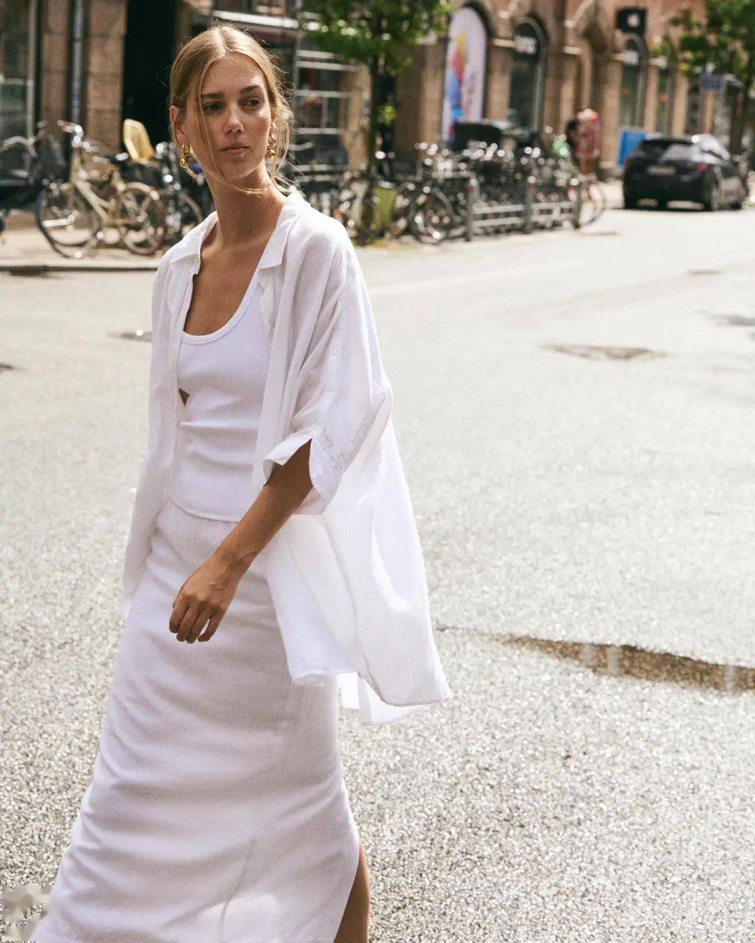 有些手臂粗的人,夏天穿無袖連衣裙什么的,就可以在外面套一件亞麻或真絲的襯衫,把襯衫袖子卷起來、下擺在高腰處打個結(jié),不僅遮肉、顯高、還防曬。