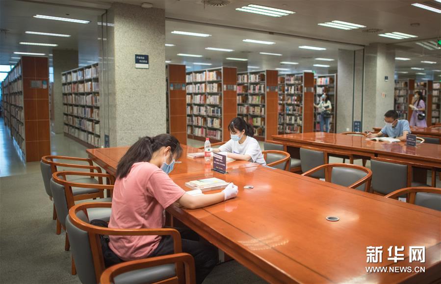 6月14日,在湖北省圖書館,市民保持距離閱覽圖書。新華社記者肖藝九攝