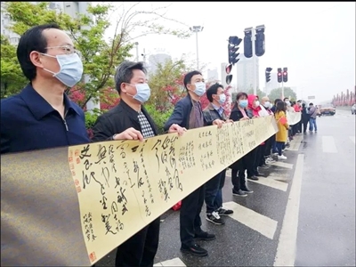 “大愛無疆”“風雨同舟”“患難與共”……一幅幅書法作品承載著書法家們對一線醫(yī)護人員的敬意?!把?,你們是文化單位的嗎?這么長一篇書法作品,真不容易,很有意義?!?得知書法家們通宵達旦潛心構(gòu)思,集體創(chuàng)作了20米的長卷,旁邊圍觀的市民們也嘖嘖贊嘆。