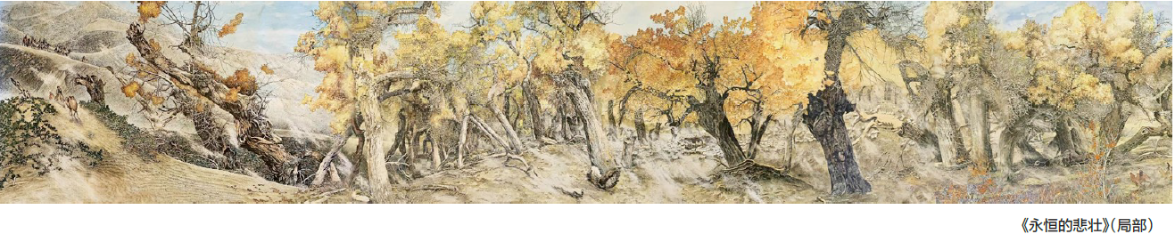 2021年4月,耗時(shí)1年的胡楊長(zhǎng)卷《永恒的悲壯》終于完成。創(chuàng)作其間,夫人不幸病重,他為了全身心照顧她,中途停筆幾個(gè)月。后來(lái)他夫人在美國(guó)去世,對(duì)他打擊巨大。以至他在接受記者采訪時(shí)說(shuō):“只有在壯美的胡楊面前,胡楊博大浪漫的情懷,才讓我無(wú)盡的情思找到了寄托;我這顆不曾平靜的心,怎么都停不下對(duì)胡楊深深的感念?!?/p>