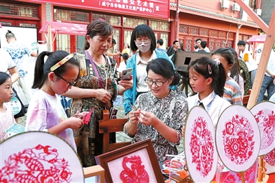 文化遺產(chǎn)展覽以圖文并茂的方式集中展示了我市市級以上非遺代表性名錄項目。在傳統(tǒng)技藝展示區(qū),木雕、竹雕、剪紙、泥塑、蛋雕產(chǎn)品依次鋪開,匠心、手藝、技藝薈萃一堂。通山剪紙傳承人忙得不亦樂乎,除了向觀眾介紹她帶來的精美展品,還指導(dǎo)前來觀眾親手體驗(yàn)剪紙的樂趣。