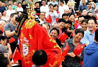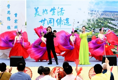 臺上,演員們傾情為大家?guī)砗贝蠊摹度绱讼眿D》、雜技《中國力量》、川劇《變臉》等形式多樣、內(nèi)容豐富的文藝表演;臺下,老百姓興致勃勃地欣賞演出,不時發(fā)出喝彩聲、鼓掌聲。