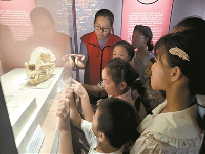 7月16日,記者走進(jìn)咸寧市博物館,這里擺放著眾多咸寧出土的寶物。更新世大熊貓頭骨化石展臺前,眾多文物愛好者正拿著手機(jī)拍照。解說員在旁邊講述著關(guān)于更新世大熊貓頭骨化石的故事。