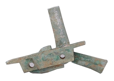 我市出土的三國·東吳銘文弩機(jī),質(zhì)地為銅,通長17.8,寬4.1,柄長7.1厘米,重量為1469克,屬三國東吳時期的遠(yuǎn)射兵器。
