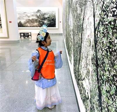 展廳內(nèi),《珠穆朗瑪》筆鋒雄渾有力,《南湖晨曦》色彩充滿激情,《四季蕪山頌》構(gòu)圖獨(dú)具匠心……在琳瑯滿目的作品前,師生們駐足良久,認(rèn)真欣賞作品上恢宏的構(gòu)圖和細(xì)膩的筆觸,感受中華山河的壯麗和作品背后傳遞出的家國(guó)情懷。