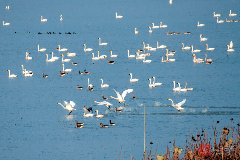 11月12日,赤壁市余家橋鄉(xiāng)東港湖,數(shù)萬(wàn)只天鵝、大雁等候鳥(niǎo)在濕地里嬉戲、覓食。