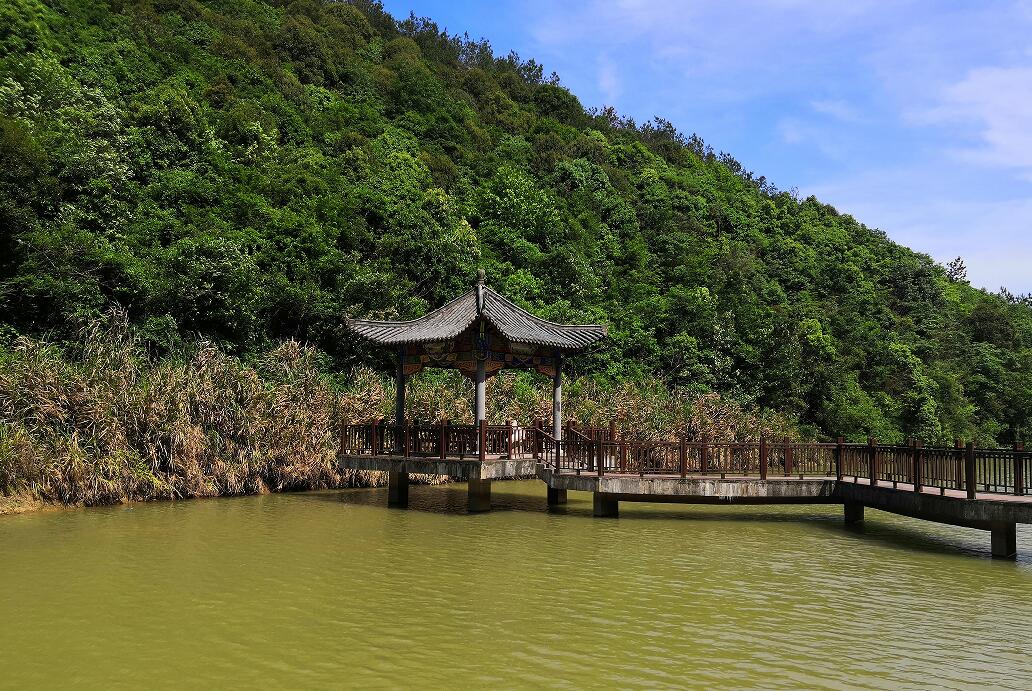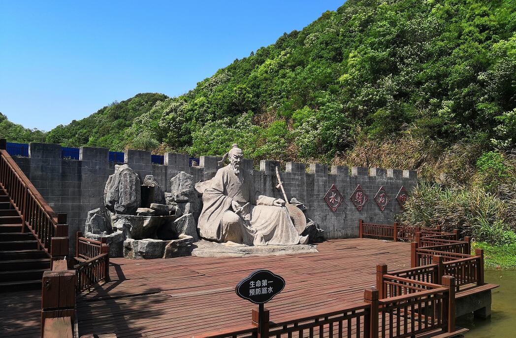 池邊的步道用木板鋪就,其中分岔出一段長(zhǎng)廊伸進(jìn)大池對(duì)岸的亭子里,那是一座由四根圓柱支撐的木構(gòu)簡(jiǎn)瓦頂涼亭,古樸典雅,莊重清逸,是為東坡亭。順著步道前行約百余米,就是“東坡洗墨池”,池水從上面的大池中汨汨流入。洗墨池旁,一尊巨大的東坡先生手握毛筆的石像端坐正中,旁邊存放著當(dāng)年的草鞋、斗笠、拐杖等,石像背后的大壩石壁上紅色的“水驛石田”四個(gè)大字因雨水的沖刷有些剝落。步道的盡頭,順著上面水池的大壩前行,便是古驛道的崎嶇山路部分。