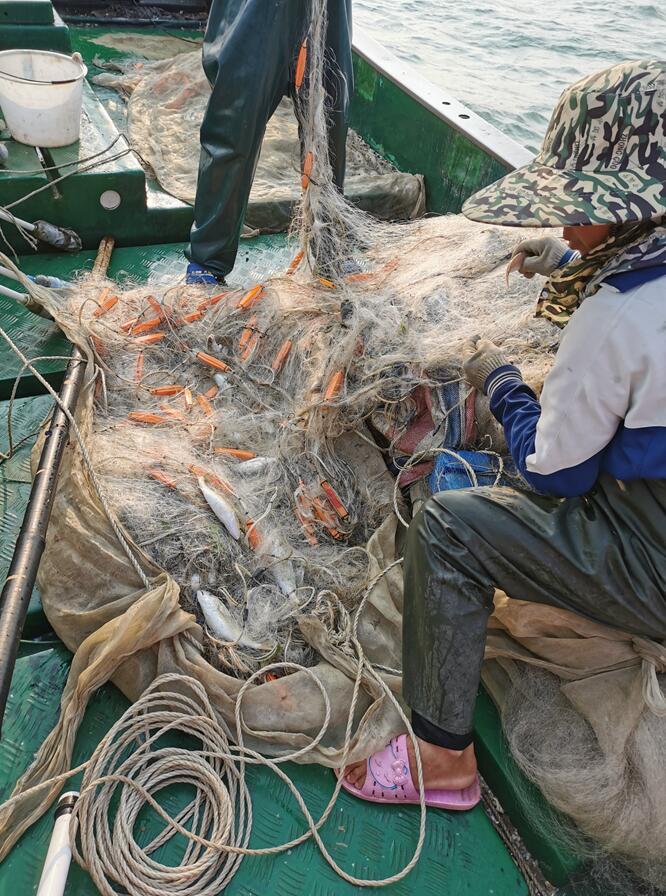 安頓下來(lái)后,有人提議出海打魚,自行解決晚餐問(wèn)題。在我們的一再要求下,老鄧夫婦答應(yīng)跟我們一起出海。說(shuō)是出海打魚,其實(shí)是老鄧夫婦倆打魚,我們坐在漁船里觀賞而已。老鄧駕船,女主人熟練地將標(biāo)有醒目印記的漁網(wǎng)依次拋向大海,一圈下來(lái),收獲滿滿,都是各種小海鮮,就在海浪將我們搖曳得快暈船的時(shí)候,我們收工回家。