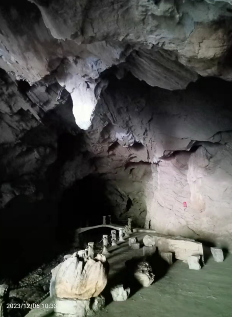 既來(lái)之,我們自然要入洞一探究竟。于是,申鳴、華清上前,我和國(guó)慶隨后,欣然入洞細(xì)看。所到之處,干濕度的確偏干,除少許洞頂有滴水的段位外,余處均無(wú)濕潤(rùn)痕跡。平生見過(guò)些石窟和山洞,橫向這么深的干洞我還是頭一次看到。在華清的提示下,我們看到洞壁上有一道道平行的流水留下的水紋。沿干砂和頁(yè)巖相間、由外向里略微下傾的崎嶇地面往里探尋,大約近四百米算是探到了盡頭。只見洞身呈“7”型下拐,“7”字的地下部分是暫未開發(fā)也無(wú)法測(cè)量的水潭。試想水潭與背面的陸水湖相通,陸水湖漲水時(shí)節(jié),水潭的水流增大,便經(jīng)洞口流向洞外的赤馬港。當(dāng)陸水湖水位下降到洞內(nèi)地平面以下,這巖洞自然就成了干洞。