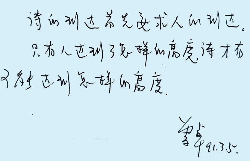 羅老師記述的現(xiàn)場(chǎng)景況很真實(shí)。我們?cè)谠霞掖蠹s坐了半個(gè)小時(shí),見他太忙不好再多打擾。他進(jìn)到書房里,一會(huì)兒出來時(shí),手上拿著一張白紙,上面是三行遒勁而灑脫的鋼筆字:“詩(shī)的到達(dá)首先要求人的到達(dá)。只有人達(dá)到了怎樣的高度,詩(shī)才有可能達(dá)到怎樣的高度?!?
