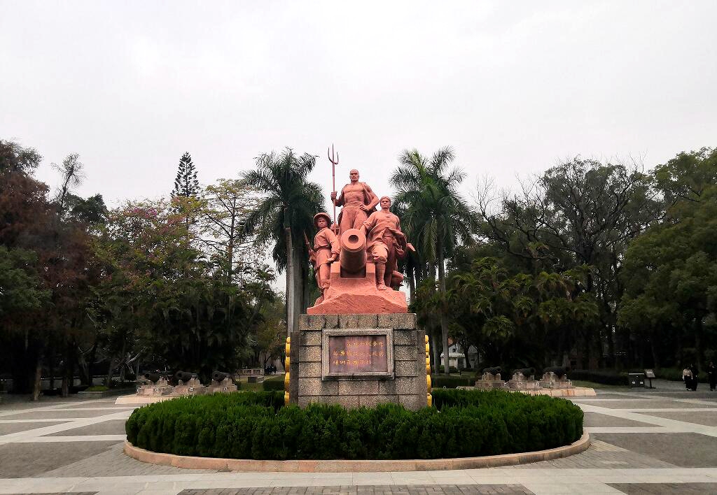 大門不寬,僅容得下一輛小車進出,走進大門,正中是一尊橘黃色現(xiàn)代群雕像,那是抗英群雕,從正面看,三個具有典型中國雕塑風格的英雄人物,手持冷兵器以正氣凜然的氣概圍繞大炮傲然屹立,底座黑色大理石上刻著“在鴉片戰(zhàn)爭英勇犧牲的人民英雄們永垂不朽”紀念文字。