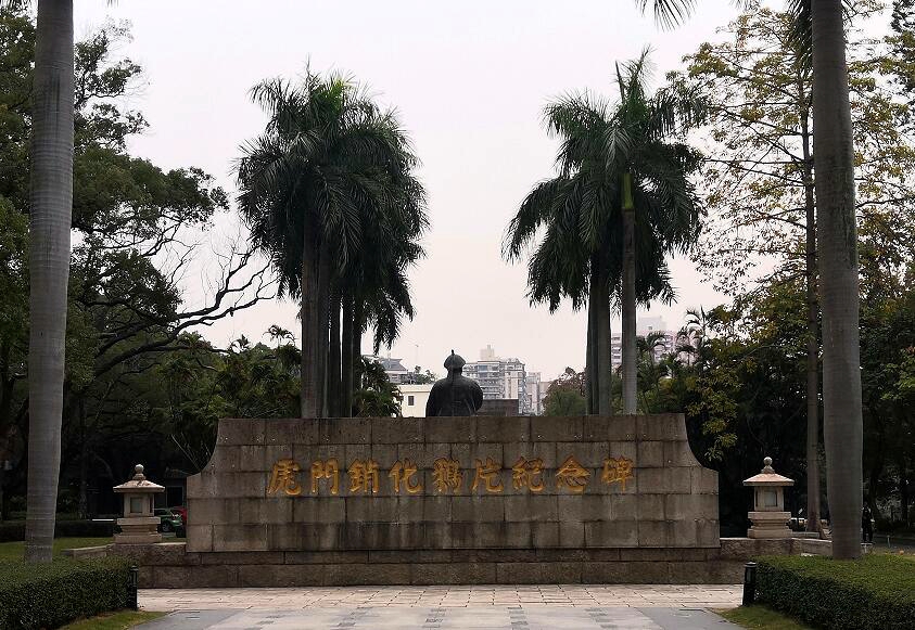 沿中軸線繼續(xù)往里走,群雕后面不遠便是林則徐雕像,緊靠雕像的是用大理石砌成的長方形紀念碑,“虎門銷化鴉片紀念碑”幾個金色大字嵌在背面。