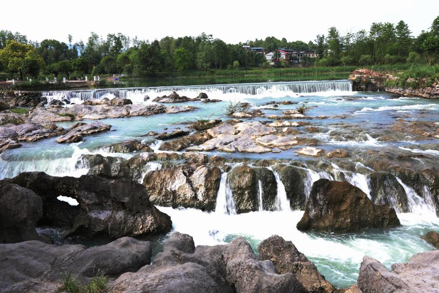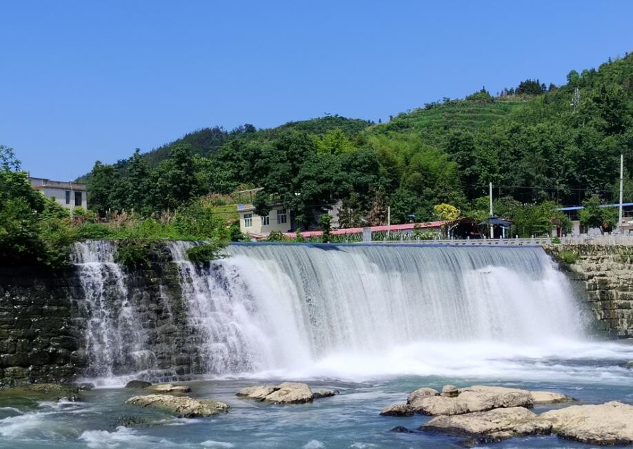 河床有許多巨石,剛瀉下來的瀑布如一群俠女躍海,揮舞著如刀似斧的波浪,在一群巨石間左奔右突,回環(huán)往復,以柔克剛,將一個個堅硬的玩石削砍得奇形怪狀,百孔千瘡,顯示出水擊石穿的神奇?zhèn)チ?。?jīng)過一番廝殺,俠女累了,不停地喘息,吐出一串串水花,最后漸趨平靜。碧水束成一川,如玉帶舒展,悠長地流向雋水河,奔往長江。