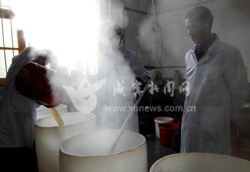 13日,記者一行來到通城縣麥?zhǔn)墟?zhèn)棋盤村鄭志敏的家里,已經(jīng)是晚上的8點(diǎn)多鐘,一家人和伙計(jì)們正在新做起來的車間里忙著稱黃豆、裝桶,準(zhǔn)備11點(diǎn)鐘的時(shí)候泡上,明早趕早打漿,好一派紅火的場面。聽說記者要來采訪,鄭志敏的父親鄭刀來高興地招呼我們,并與我們攀談起他和兒子的“豆腐經(jīng)”。