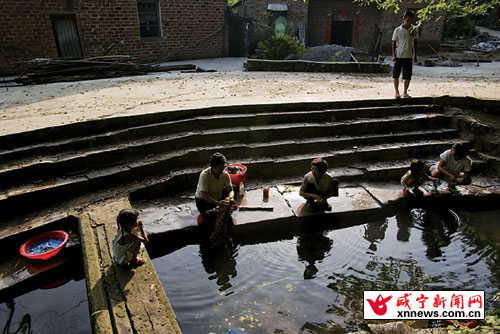 越過層層稻田,鉆過橫空越過的赤馬港渡槽,繞過一汪綠樹環(huán)繞的清潭,一個(gè)面東的半弧形院落呈現(xiàn)在眼前。斑駁的高墻,黛色的瓦,顯示著村落曾經(jīng)的輝煌。老院古樸而親切,就像童年記憶中外婆的家。一棵碗口粗的柳樹立在院口,枝條密密匝匝地垂了下來,讓白晃晃的水泥地生出一絲絲涼氣。