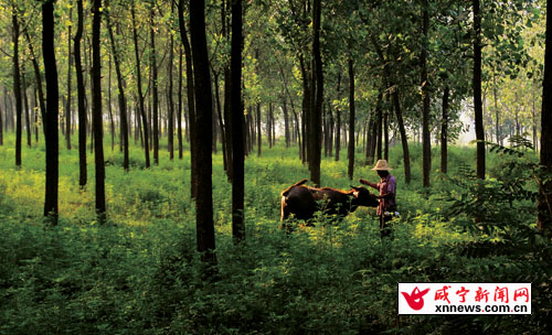 一進(jìn)村,你就被淹沒在了茫茫的綠色里:一株株、一排排意楊拔地而起,林間綠草葳蕤,薄霧輕籠。浩浩十里速生林為洞門口吳家村擋著京廣鐵路、107國道上南來北往車輛的噪聲,也為這個(gè)小村莊擋住了漫天的灰塵和城市的喧囂。