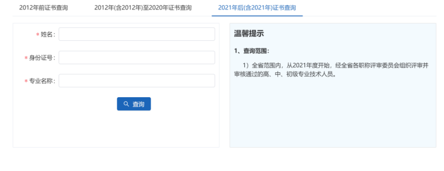 02?根據(jù)取得職稱的時間,在頁面下輸入對應的姓名、身份證號及專業(yè)即可查詢到職稱電子證書信息。