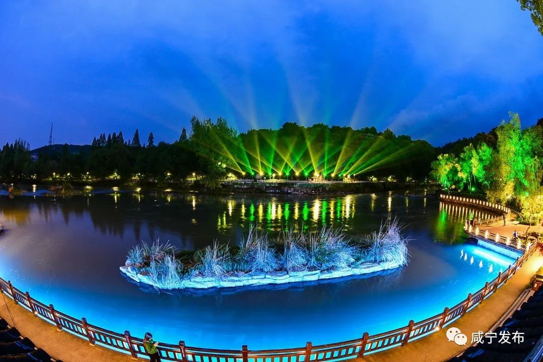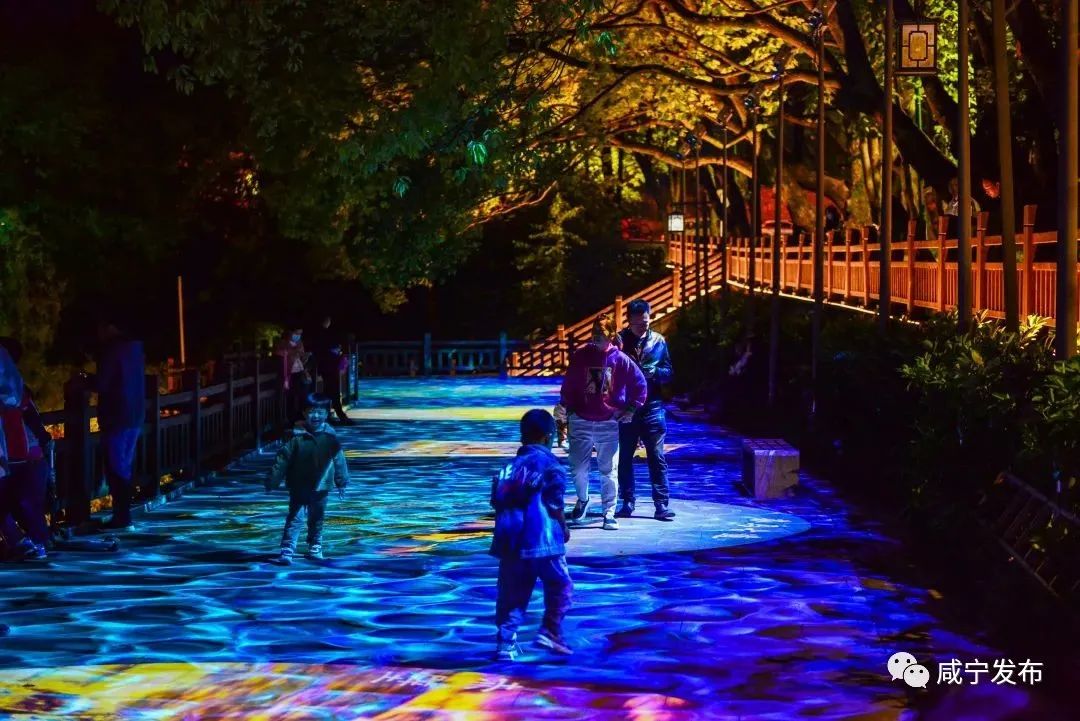 沿河的廊道變幻各色燈光,路面燈光如水波紋蕩漾,與波光粼粼的河面相映成趣。路面上還投射了咸寧地標建筑、特產(chǎn)等本土特色元素。