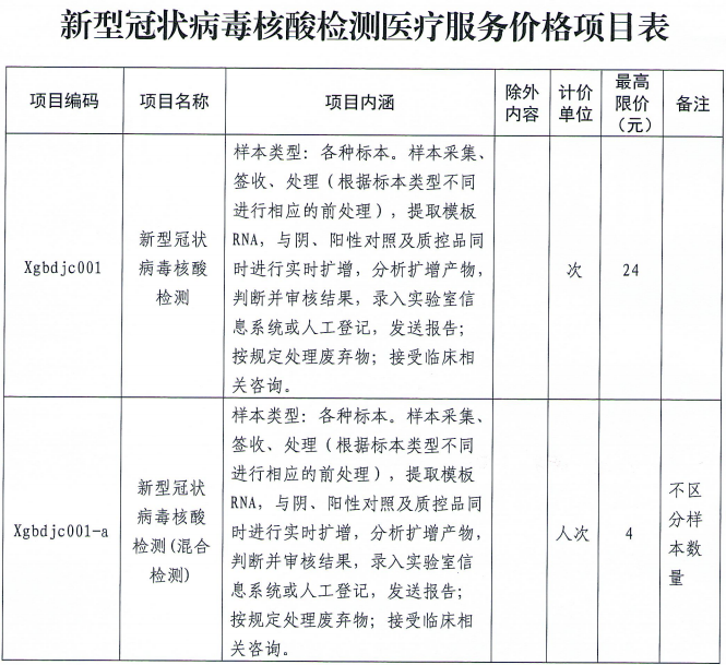 新型冠狀病毒核酸檢測項目價格的通知