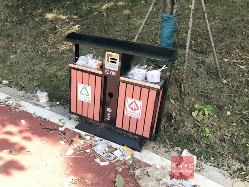 垃圾桶旁散落一地垃圾
