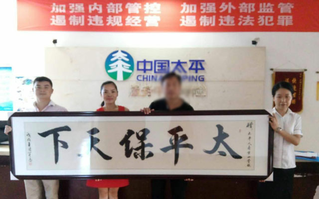 八月的一個(gè)早上,位于太平人壽京山營(yíng)服的公司職場(chǎng)剛打開大門,一塊長(zhǎng)匾隨即躍入了工作人員的眼簾。原來是客戶何先生給公司送來了長(zhǎng)匾,上書“太平保天下”,以此匾來感謝太平人壽的快速理賠。