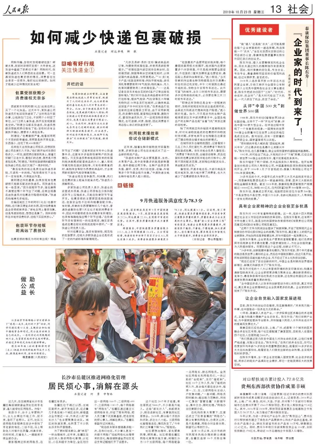 今日,《人民日報》“優(yōu)秀建設者”專欄刊登泰康保險集團創(chuàng)始人、董事長兼首席執(zhí)行官陳東升專訪文章——《企業(yè)家的時代到來了!》。繼去年入選改革開放40周年百名杰出民營企業(yè)家后,今年陳東升董事長又被評為全國非公有制經濟人士優(yōu)秀中國特色社會主義事業(yè)建設者?!度嗣袢請蟆芬藐悥|升的話指出,“當一家企業(yè)自覺融入國家發(fā)展、社會進步的進程,用自己的現實產品滿足社會需求,那它一定能獲得巨大的發(fā)展空間。”