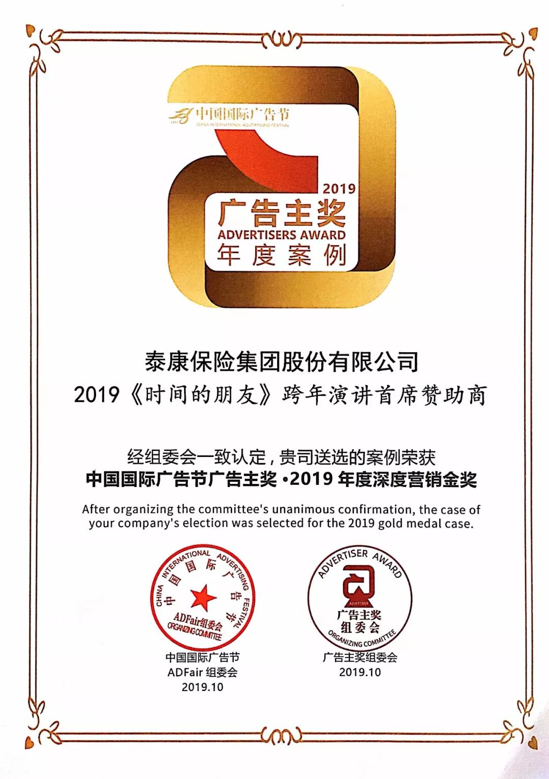 10月25日至28日,第26屆中國(guó)國(guó)際廣告節(jié)在江西南昌舉行。在2019廣告主年度盛典上,泰康·幸福有約首席贊助2019《時(shí)間的朋友》跨年演講案例從上萬(wàn)個(gè)參賽作品中脫穎而出,榮獲“中國(guó)國(guó)際廣告節(jié)廣告主獎(jiǎng)·2019年度深度營(yíng)銷金獎(jiǎng)”。這也是泰康繼2010、2016年獲得長(zhǎng)城獎(jiǎng)后,第三次獲得中國(guó)廣告界最權(quán)威獎(jiǎng)項(xiàng)。