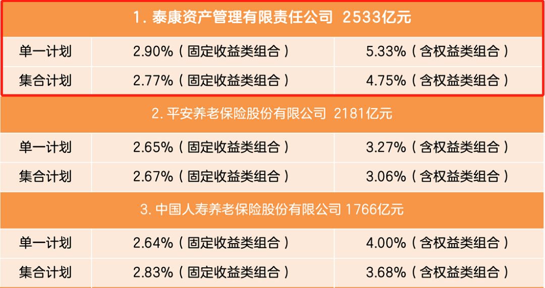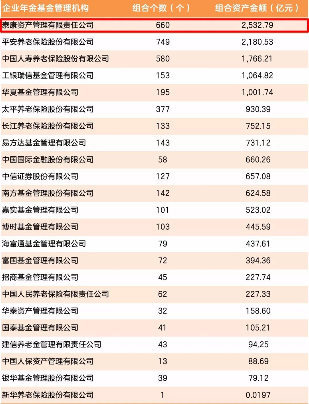 自2018年第二季度以來,泰康資產(chǎn)躍居企業(yè)年金投資管理規(guī)模市場第一。截至2019年二季度末,泰康資產(chǎn)管理的企業(yè)年金組合資產(chǎn)規(guī)模達(dá)2,532.79億元,是目前國內(nèi)最大的企業(yè)年金投資管理人。