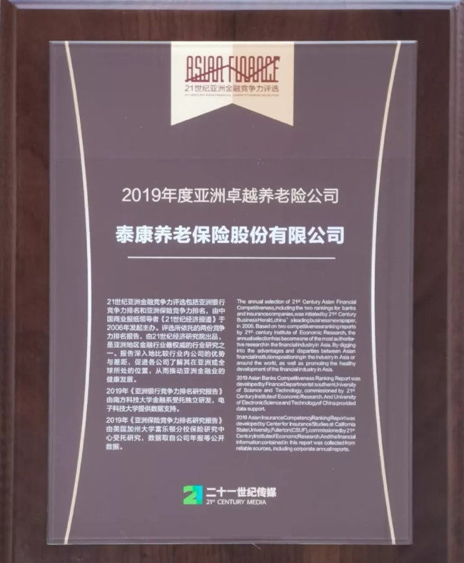 11月19日,“第十四屆21世紀亞洲金融年會”在北京召開。會上由21世紀研究院金融研究中心出品、美國加州大學富樂頓分校風險管理與保險學院受托研發(fā)的《2019亞洲保險競爭力研究報告》顯示,2018年,中國保持亞洲第一及世界第二大的保險市場,泰康人壽名列中國壽險十強第四,躋身亞洲壽險十強第八,泰康養(yǎng)老位列中國養(yǎng)老保險公司第二,較去年上升一位。在單項排名中,泰康人壽穩(wěn)定性單項排名中國壽險公司第一。會上,泰康養(yǎng)老榮獲2019年度亞洲卓越養(yǎng)老險公司,這也是泰康養(yǎng)老連續(xù)三年榮膺該獎項。