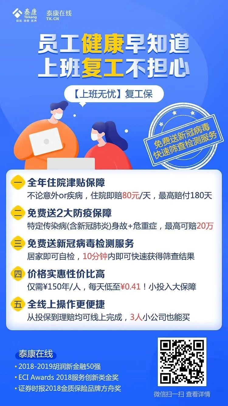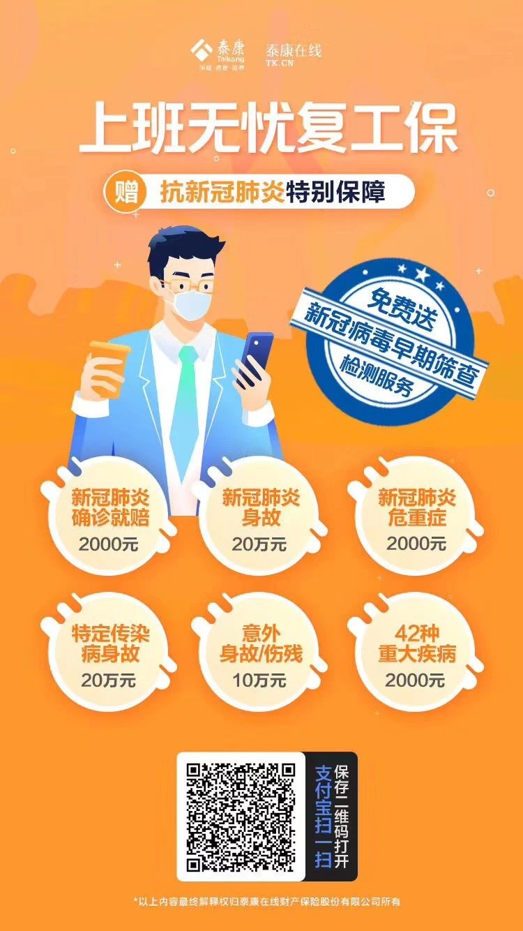 為貫徹落實黨中央、國務院決策部署,積極響應銀保監(jiān)會做好金融服務,支持企業(yè)復工復產(chǎn)的要求。近日,泰康保險集團旗下泰康在線推出“復工?!北kU計劃,通過擴展保險保障責任加贈送新冠病毒ImG抗體檢測服務的雙重保障方式,為企業(yè)復工復產(chǎn)保駕護航。據(jù)悉,泰康在線已提供保險計劃優(yōu)先保障醫(yī)藥流通、基因檢測等重點行業(yè)企業(yè)運營。