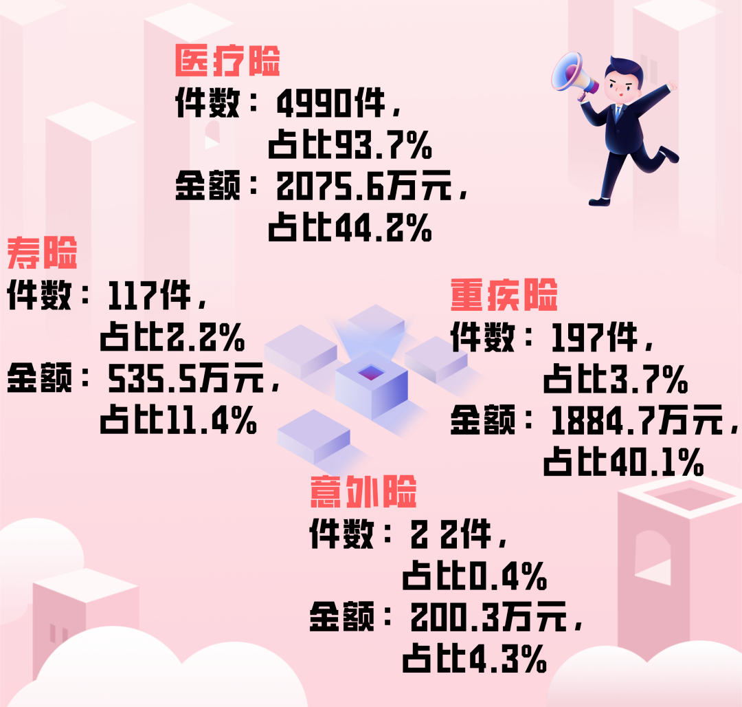 ? ? ?賠案依然以醫(yī)療險(xiǎn)為主,件數(shù)占比超過(guò)總體的93.7%,與上月基本持平。