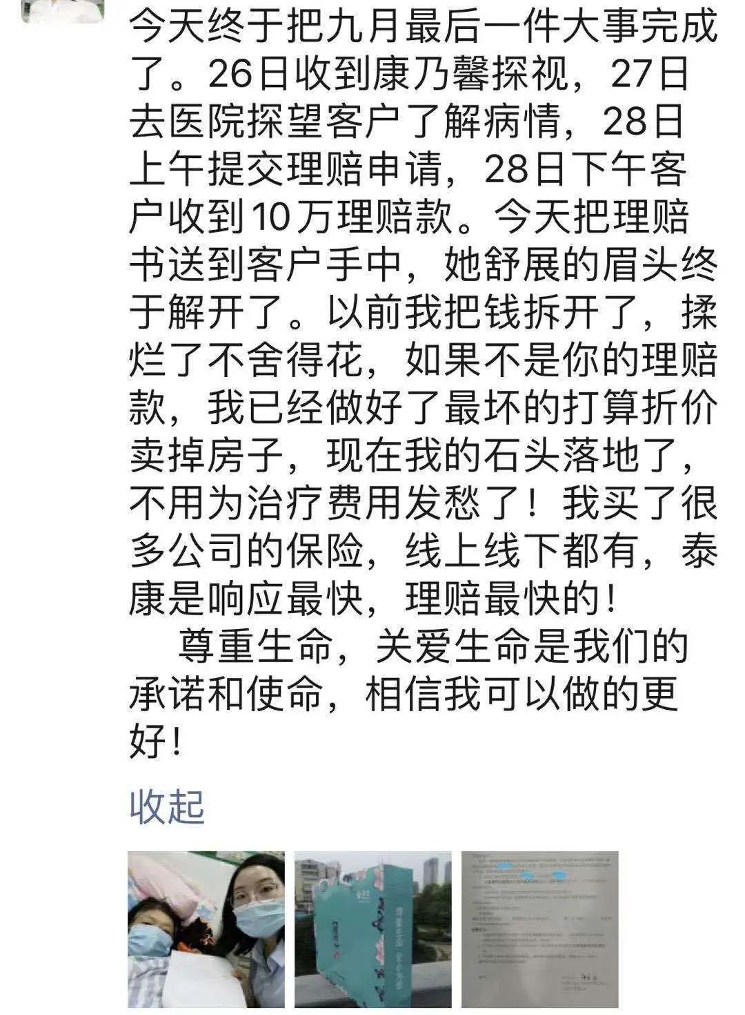 九月,我們看到這樣一篇感人朋友圈,襄陽(yáng)泰星代理人張玉華女士在為客戶送去重疾先賠服務(wù)后有感而發(fā)。
