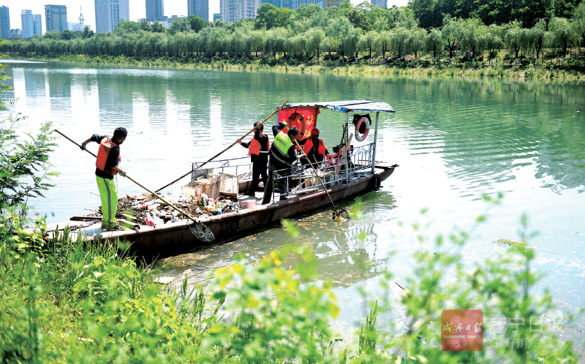 5月6日,啟迪城服咸寧城市服務有限公司員工在淦河城區(qū)段清理沿河漂浮物。