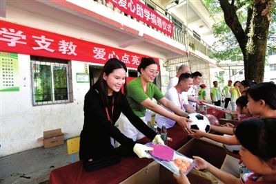 7月13日,咸安區(qū)大幕鄉(xiāng)金雞山小學(xué),愛心企業(yè)家將捐贈的物資送到孩子們的手中。